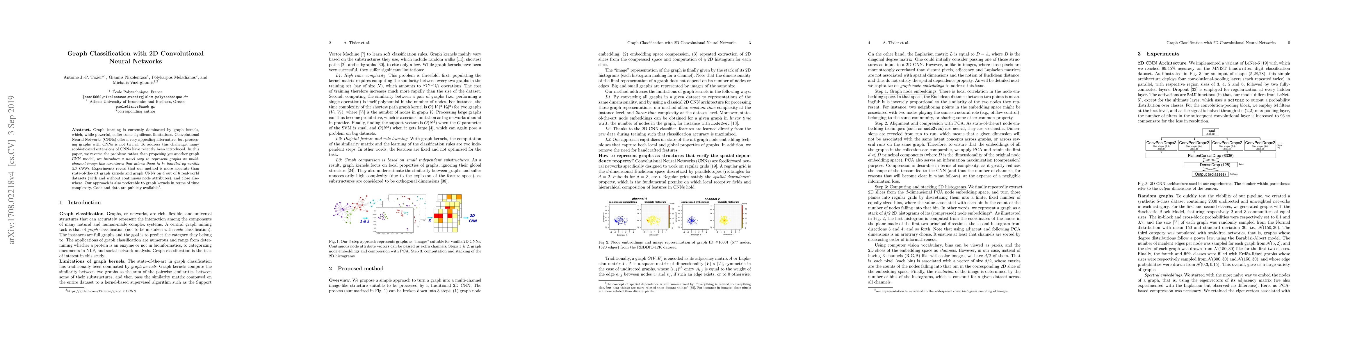This paper proposes a method to represent graphs as multi-channel image-like structures, enabling the use of vanilla 2D Convolutional Neural Networks (CNNs) for graph classification. The approach shows superior accuracy over state-of-the-art graph kernels and graph CNNs on several real-world datasets, with better time complexity.