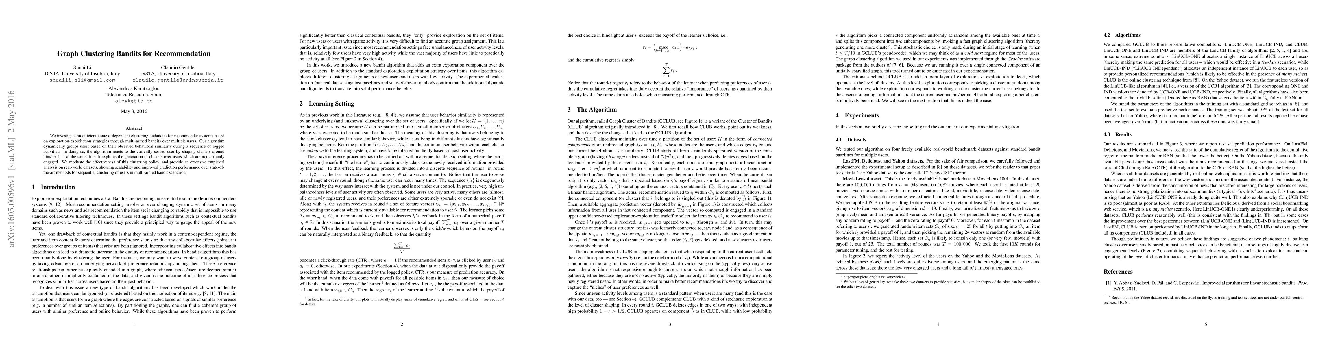 We investigate an efficient context-dependent clustering technique for recommender systems based on exploration-exploitation strategies through multi-armed bandits over multiple users. Our algorithm dynamically groups users based on their observed behavioral similarity during a sequence of logged activities. In doing so, the algorithm reacts to the currently served user by shaping clusters around him/her but, at the same time, it explores the generation of clusters over users which are not currently engaged. We motivate the effectiveness of this clustering policy, and provide an extensive empirical analysis on real-world datasets, showing scalability and improved prediction performance over state-of-the-art methods for sequential clustering of users in multi-armed bandit scenarios.