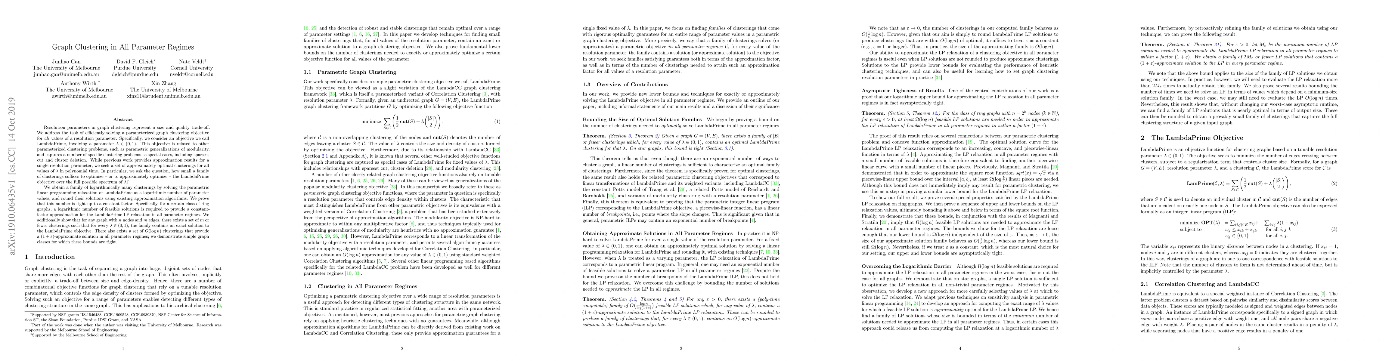 This paper addresses the efficient solution of a parameterized graph clustering objective, LambdaPrime, across all values of a resolution parameter $\lambda$. The authors propose a method to obtain a family of logarithmically many clusterings by solving a parametric linear programming relaxation, proving that this number is optimal for certain graph classes. They also show that a set of $m$ or fewer clusterings can provide exact solutions for any graph, and $O(\log n)$ clusterings can offer $(1+\varepsilon)$-approximations for all $\lambda$.