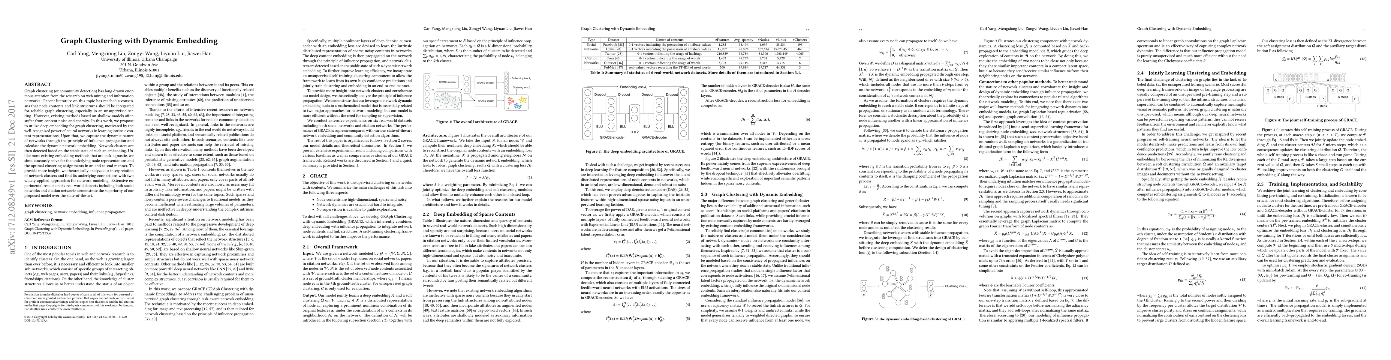 Graph clustering (or community detection) has long drawn enormous attention from the research on web mining and information networks. Recent literature on this topic has reached a consensus that node contents and link structures should be integrated for reliable graph clustering, especially in an unsupervised setting. However, existing methods based on shallow models often suffer from content noise and sparsity. In this work, we propose to utilize deep embedding for graph clustering, motivated by the well-recognized power of neural networks in learning intrinsic content representations. Upon that, we capture the dynamic nature of networks through the principle of influence propagation and calculate the dynamic network embedding. Network clusters are then detected based on the stable state of such an embedding. Unlike most existing embedding methods that are task-agnostic, we simultaneously solve for the underlying node representations and the optimal clustering assignments in an end-to-end manner. To provide more insight, we theoretically analyze our interpretation of network clusters and find its underlying connections with two widely applied approaches for network modeling. Extensive experimental results on six real-world datasets including both social networks and citation networks demonstrate the superiority of our proposed model over the state-of-the-art.