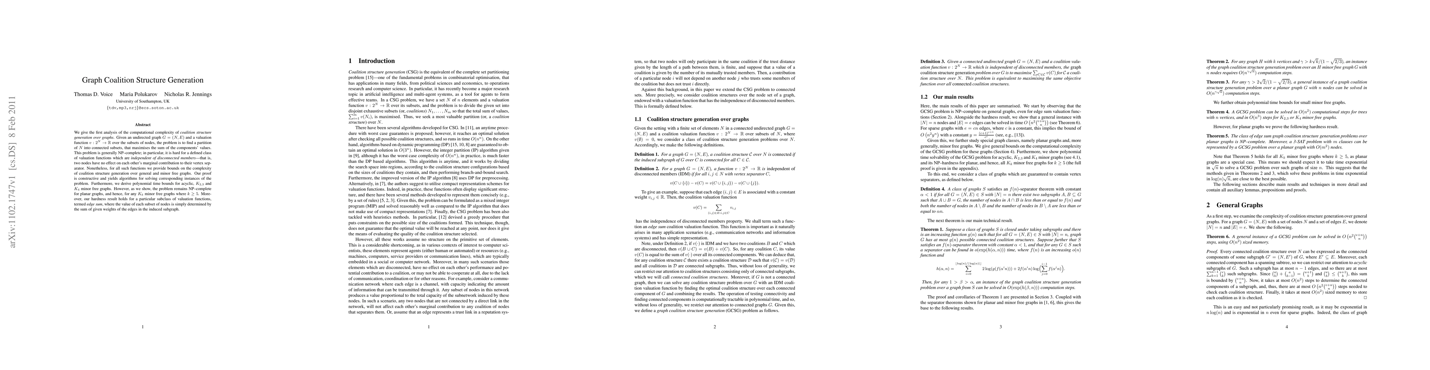 This paper analyzes the computational complexity of generating coalition structures over graphs, proving that the problem is NP-complete in general. It provides constructive algorithms and complexity bounds for specific graph classes, including acyclic and minor-free graphs, while confirming NP-completeness for planar and higher minor-free graphs.
