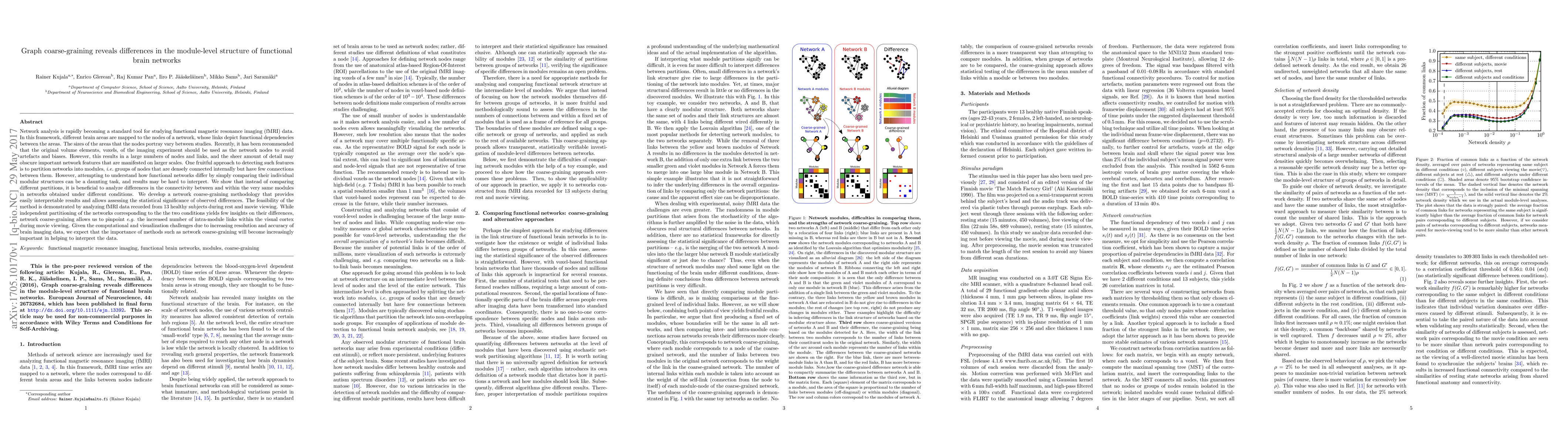 Network analysis is rapidly becoming a standard tool for studying functional magnetic resonance imaging (fMRI) data. In this framework, different brain areas are mapped to the nodes of a network, whose links depict functional dependencies between the areas. The sizes of the areas that the nodes portray vary between studies. Recently, it has been recommended that the original volume elements, voxels, of the imaging experiment should be used as the network nodes to avoid artefacts and biases. However, this results in a large numbers of nodes and links, and the sheer amount of detail may obscure important network features that are manifested on larger scales. One fruitful approach to detecting such features is to partition networks into modules, i.e. groups of nodes that are densely connected internally but have few connections between them. However, attempting to understand how functional networks differ by simply comparing their individual modular structures can be a daunting task, and results may be hard to interpret. We show that instead of comparing different partitions, it is beneficial to analyze differences in the connectivity between and within the very same modules in networks obtained under different conditions. We develop a network coarse-graining methodology that provides easily interpretable results and allows assessing the statistical significance of observed differences. The feasibility of the method is demonstrated by analyzing fMRI data recorded from 13 healthy subjects during rest and movie viewing. While independent partitioning of the networks corresponding to the the two conditions yields few insights on their differences, network coarse-graining allows us to pinpoint e.g. the increased number of intra-module links within the visual cortex during movie viewing.