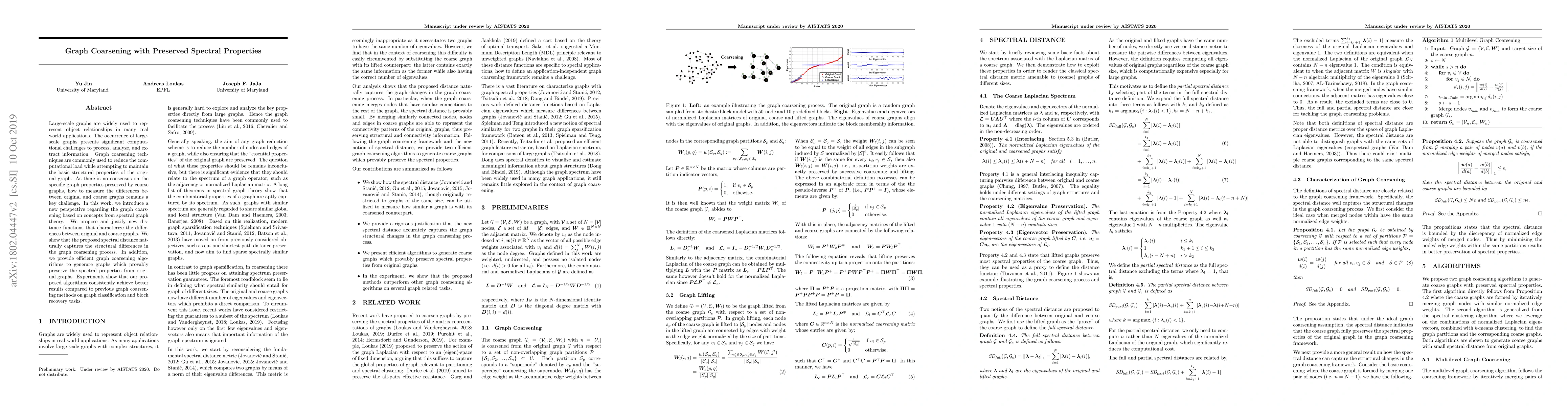 This paper proposes new spectral distance functions to measure differences between original and coarsened graphs, introducing efficient graph coarsening algorithms that preserve spectral properties. Experimental results demonstrate superior performance on graph classification and block recovery tasks compared to existing methods.