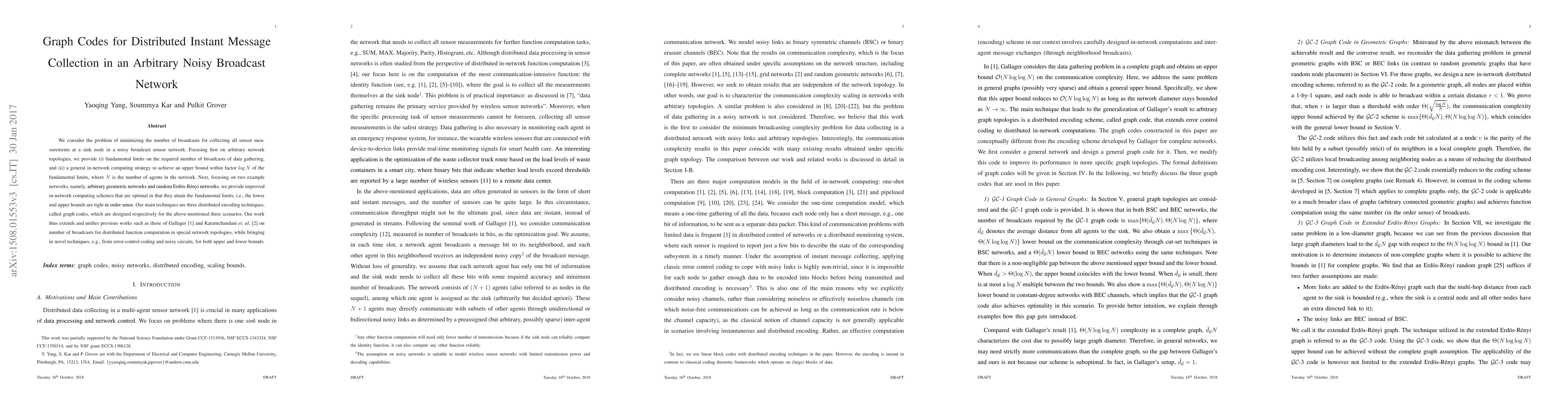 We consider the problem of minimizing the number of broadcasts for collecting all sensor measurements at a sink node in a noisy broadcast sensor network. Focusing first on arbitrary network topologies, we provide (i) fundamental limits on the required number of broadcasts of data gathering, and (ii) a general in-network computing strategy to achieve an upper bound within factor $\log N$ of the fundamental limits, where $N$ is the number of agents in the network. Next, focusing on two example networks, namely, \textcolor{black}{arbitrary geometric networks and random Erd$\ddot{o}$s-R$\acute{e}$nyi networks}, we provide improved in-network computing schemes that are optimal in that they attain the fundamental limits, i.e., the lower and upper bounds are tight \textcolor{black}{in order sense}. Our main techniques are three distributed encoding techniques, called graph codes, which are designed respectively for the above-mentioned three scenarios. Our work thus extends and unifies previous works such as those of Gallager [1] and Karamchandani~\emph{et. al.} [2] on number of broadcasts for distributed function computation in special network topologies, while bringing in novel techniques, e.g., from error-control coding and noisy circuits, for both upper and lower bounds.