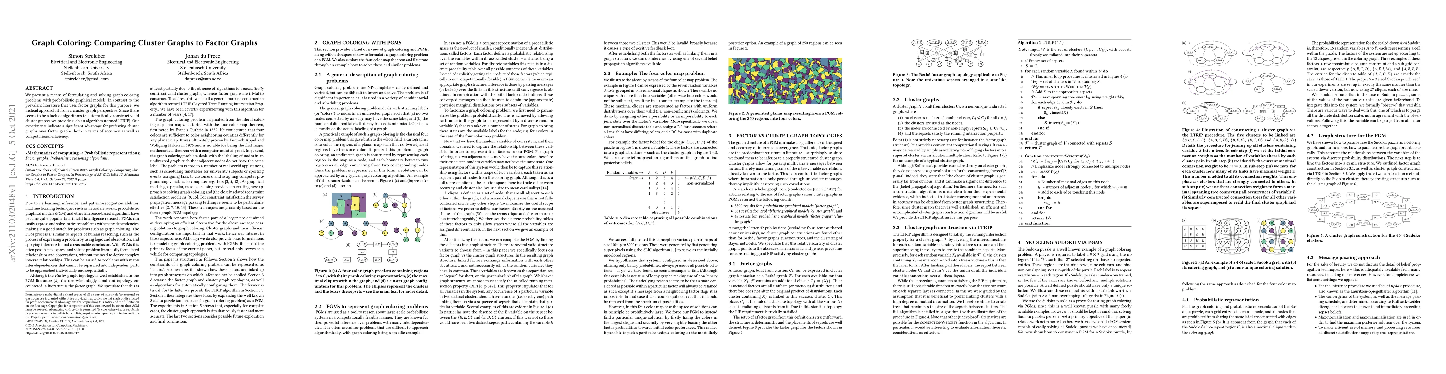 This paper proposes using cluster graphs instead of factor graphs for solving graph coloring problems, introducing an algorithm (LTRIP) to construct valid cluster graphs. Experimental results show that cluster graphs outperform factor graphs in both accuracy and computational efficiency.
