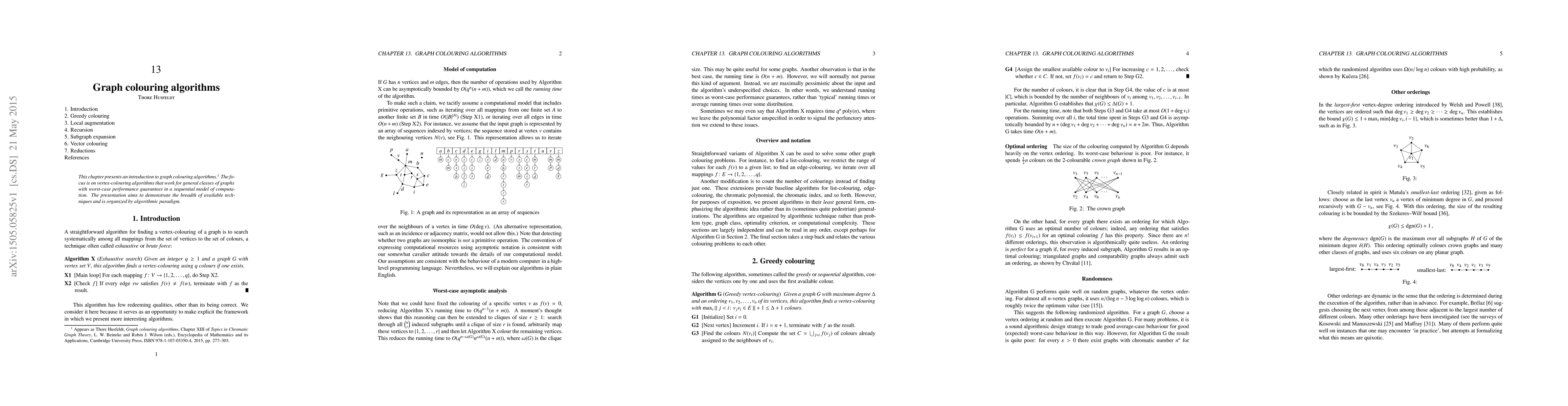 This chapter introduces graph colouring algorithms that guarantee optimal performance for various types of graphs. It showcases different algorithmic paradigms to tackle vertex-colouring problems.