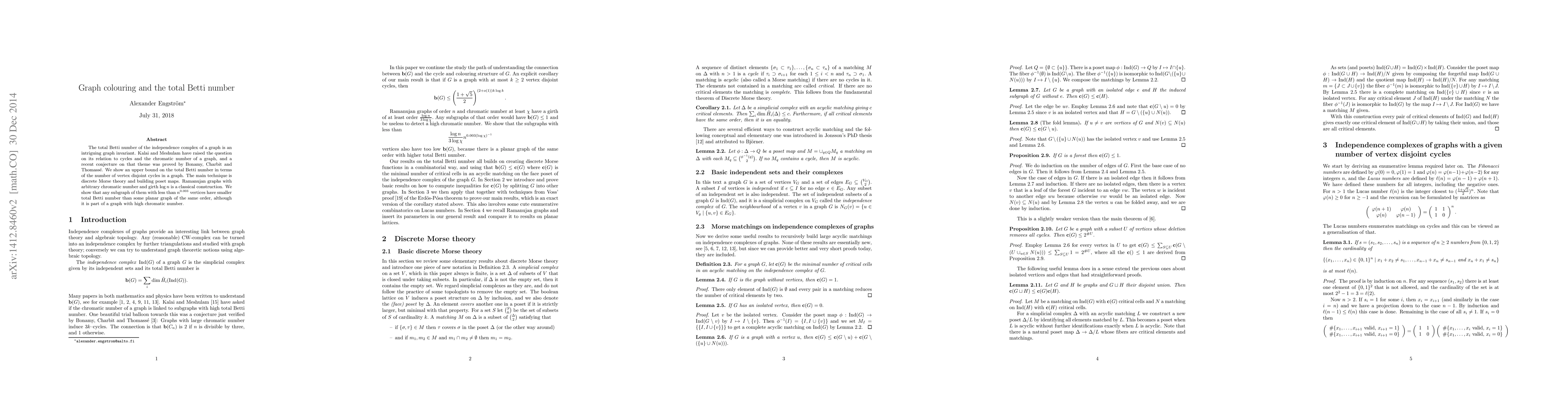 The total Betti number of the independence complex of a graph is an intriguing graph invariant. Kalai and Meshulam have raised the question on its relation to cycles and the chromatic number of a graph, and a recent conjecture on that theme was proved by Bonamy, Charbit and Thomasse. We show an upper bound on the total Betti number in terms of the number of vertex disjoint cycles in a graph. The main technique is discrete Morse theory and building poset maps. Ramanujan graphs with arbitrary chromatic number and girth log(n) is a classical construction. We show that any subgraph of them with less than n^0.003 vertices have smaller total Betti number than some planar graph of the same order, although it is part of a graph with high chromatic number.