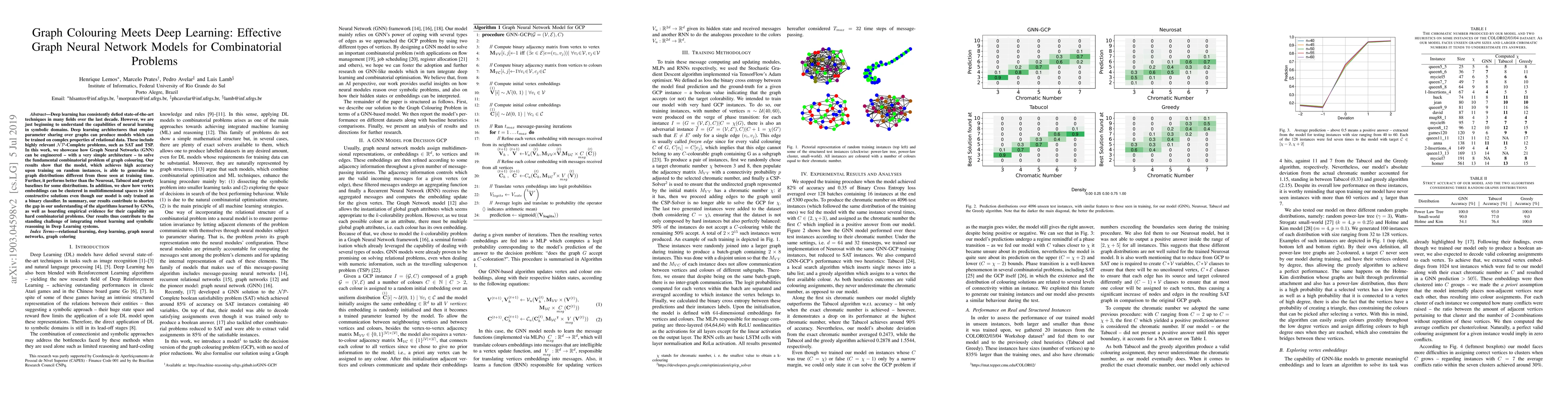 Deep learning has consistently defied state-of-the-art techniques in many fields over the last decade. However, we are just beginning to understand the capabilities of neural learning in symbolic domains. Deep learning architectures that employ parameter sharing over graphs can produce models which can be trained on complex properties of relational data. These include highly relevant NP-Complete problems, such as SAT and TSP. In this work, we showcase how Graph Neural Networks (GNN) can be engineered -- with a very simple architecture -- to solve the fundamental combinatorial problem of graph colouring. Our results show that the model, which achieves high accuracy upon training on random instances, is able to generalise to graph distributions different from those seen at training time. Further, it performs better than the Neurosat, Tabucol and greedy baselines for some distributions. In addition, we show how vertex embeddings can be clustered in multidimensional spaces to yield constructive solutions even though our model is only trained as a binary classifier. In summary, our results contribute to shorten the gap in our understanding of the algorithms learned by GNNs, as well as hoarding empirical evidence for their capability on hard combinatorial problems. Our results thus contribute to the standing challenge of integrating robust learning and symbolic reasoning in Deep Learning systems.