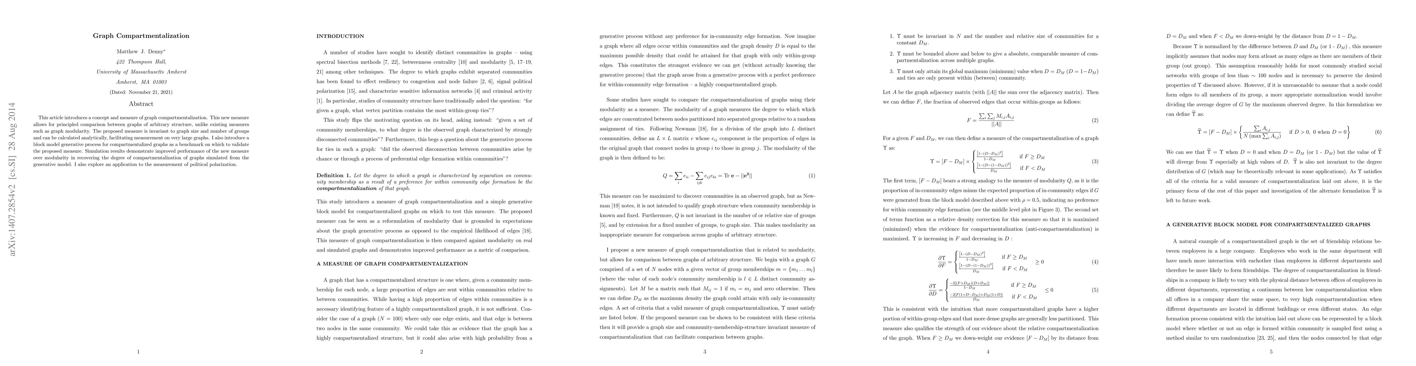 This paper proposes a new measure of graph compartmentalization that allows for fair comparisons across graphs, unlike existing measures like graph modularity. It demonstrates superior performance in detecting compartmentalization in simulated graphs and applies the method to measure political polarization.