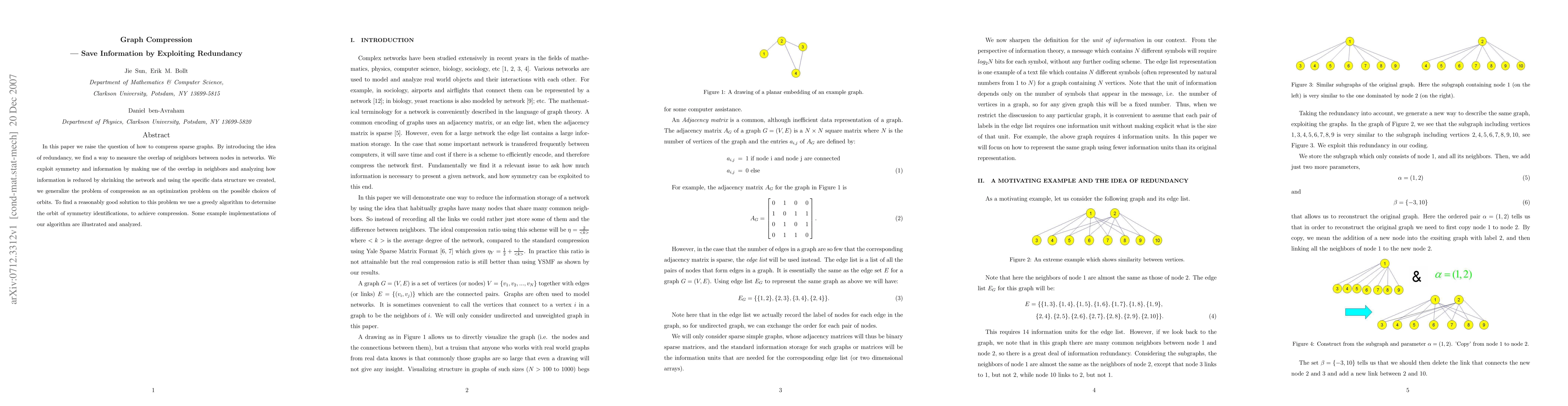 This paper proposes a method for compressing sparse graphs by exploiting redundancy through neighbor overlap, framing the problem as an optimization task on symmetry orbits. A greedy algorithm is used to identify orbits for effective compression, with examples demonstrating the approach.