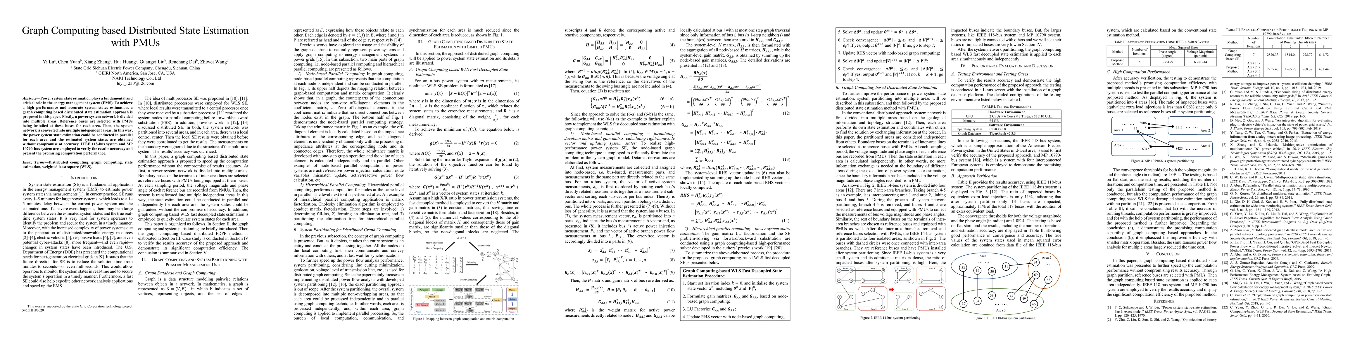 This paper proposes a graph computing based distributed state estimation method using PMUs for power systems, dividing the system into independent areas for parallel estimation to enhance accuracy and performance. The method is validated on IEEE 118-bus and MP 10790-bus systems, demonstrating promising results.