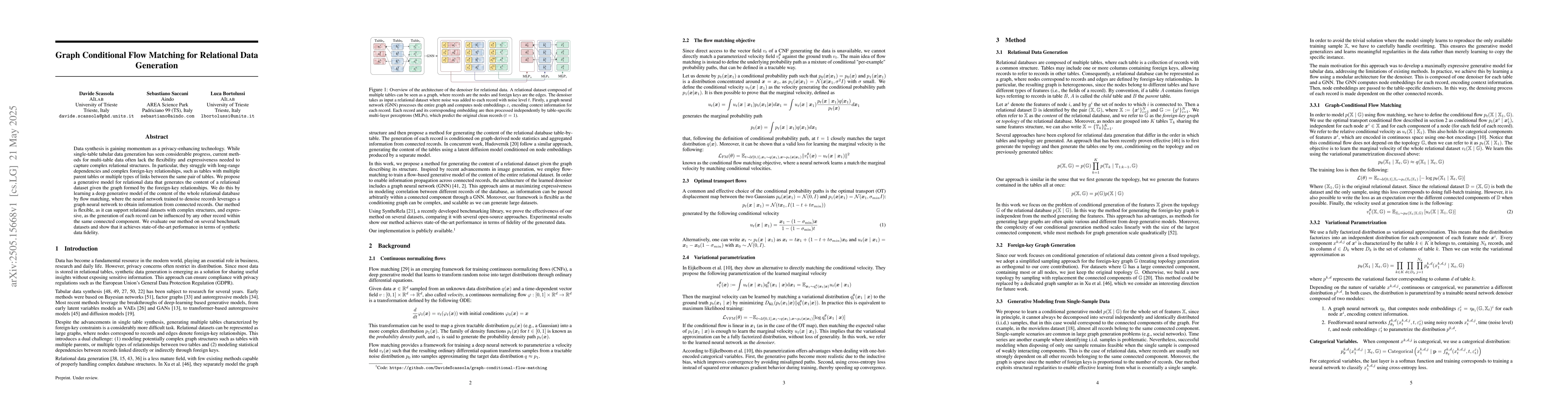 Data synthesis is gaining momentum as a privacy-enhancing technology. While single-table tabular data generation has seen considerable progress, current methods for multi-table data often lack the flexibility and expressiveness needed to capture complex relational structures. In particular, they struggle with long-range dependencies and complex foreign-key relationships, such as tables with multiple parent tables or multiple types of links between the same pair of tables. We propose a generative model for relational data that generates the content of a relational dataset given the graph formed by the foreign-key relationships. We do this by learning a deep generative model of the content of the whole relational database by flow matching, where the neural network trained to denoise records leverages a graph neural network to obtain information from connected records. Our method is flexible, as it can support relational datasets with complex structures, and expressive, as the generation of each record can be influenced by any other record within the same connected component. We evaluate our method on several benchmark datasets and show that it achieves state-of-the-art performance in terms of synthetic data fidelity.