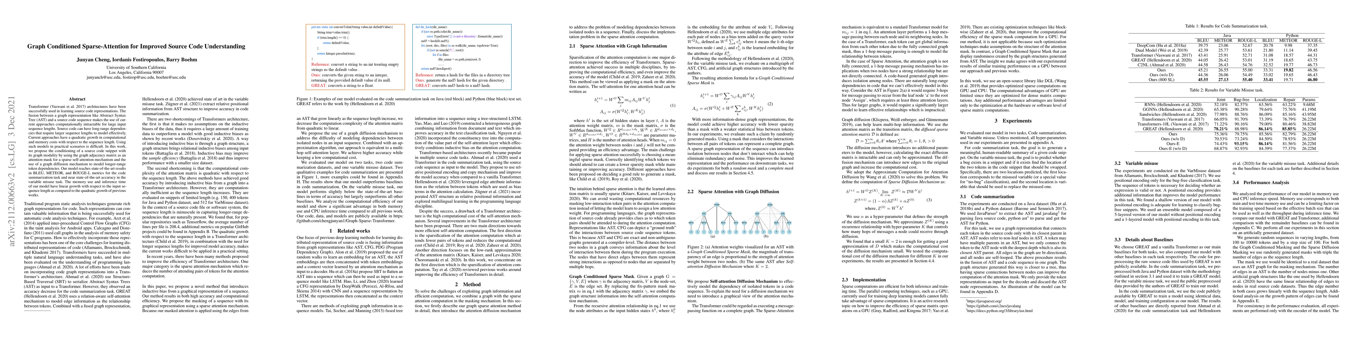 Transformer architectures have been successfully used in learning source code representations. The fusion between a graph representation like Abstract Syntax Tree (AST) and a source code sequence makes the use of current approaches computationally intractable for large input sequence lengths. Source code can have long-range dependencies that require larger sequence lengths to model effectively. Current approaches have a quadratic growth in computational and memory costs with respect to the sequence length. Using such models in practical scenarios is difficult. In this work, we propose the conditioning of a source code snippet with its graph modality by using the graph adjacency matrix as an attention mask for a sparse self-attention mechanism and the use of a graph diffusion mechanism to model longer-range token dependencies. Our model reaches state-of-the-art results in BLEU, METEOR, and ROUGE-L metrics for the code summarization task and near state-of-the-art accuracy in the variable misuse task. The memory use and inference time of our model have linear growth with respect to the input sequence length as compared to the quadratic growth of previous works.