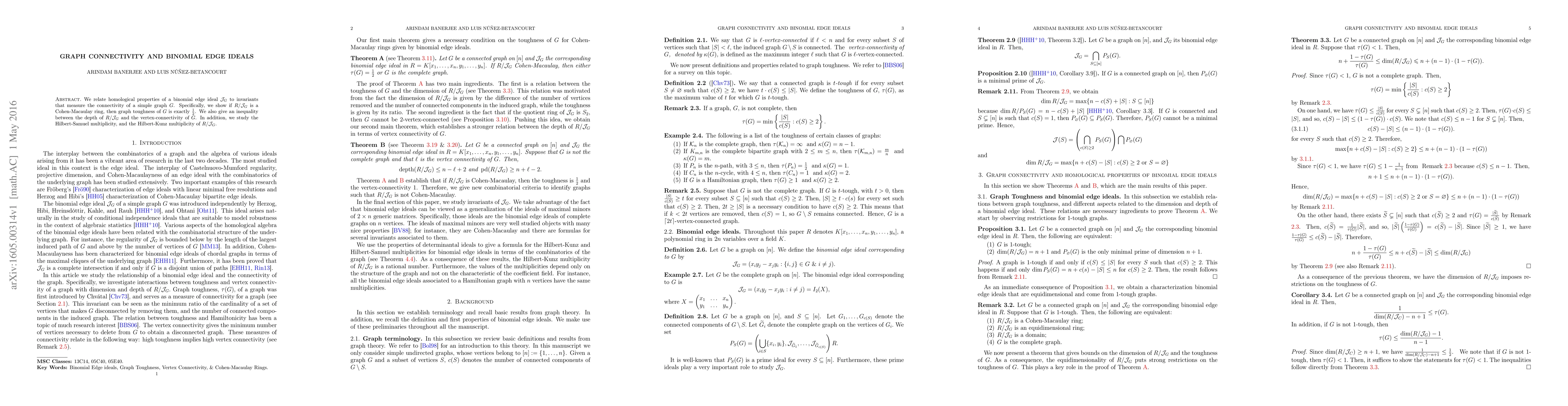 We relate homological properties of a binomial edge ideal $\mathcal{J}_G$ to invariants that measure the connectivity of a simple graph $G$. Specifically, we show if $R/\mathcal{J}_G$ is a Cohen-Macaulay ring, then graph toughness of $G$ is exactly $\frac{1}{2}$. We also give an inequality between the depth of $R/\mathcal{J}_G$ and the vertex-connectivity of $G$. In addition, we study the Hilbert-Samuel multiplicity, and the Hilbert-Kunz multiplicity of $R/\mathcal{J}_G$.