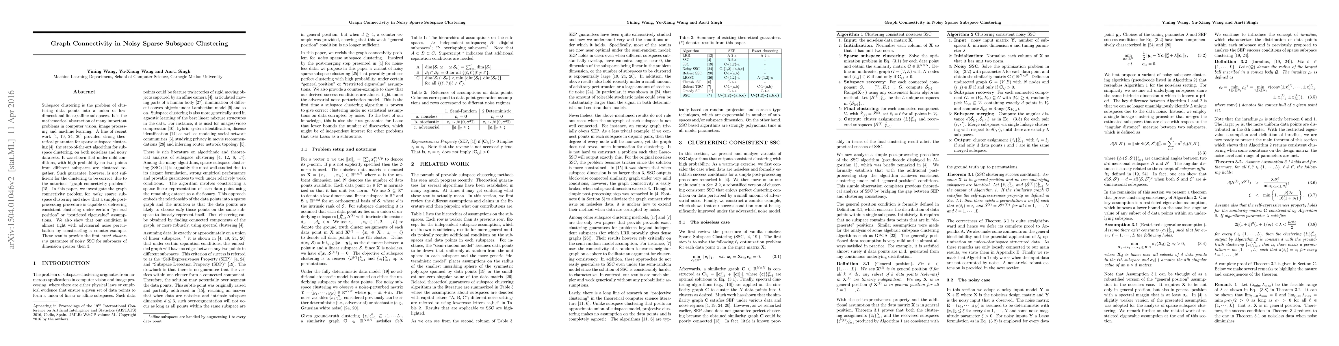Subspace clustering is the problem of clustering data points into a union of low-dimensional linear/affine subspaces. It is the mathematical abstraction of many important problems in computer vision, image processing and machine learning. A line of recent work (4, 19, 24, 20) provided strong theoretical guarantee for sparse subspace clustering (4), the state-of-the-art algorithm for subspace clustering, on both noiseless and noisy data sets. It was shown that under mild conditions, with high probability no two points from different subspaces are clustered together. Such guarantee, however, is not sufficient for the clustering to be correct, due to the notorious "graph connectivity problem" (15). In this paper, we investigate the graph connectivity problem for noisy sparse subspace clustering and show that a simple post-processing procedure is capable of delivering consistent clustering under certain "general position" or "restricted eigenvalue" assumptions. We also show that our condition is almost tight with adversarial noise perturbation by constructing a counter-example. These results provide the first exact clustering guarantee of noisy SSC for subspaces of dimension greater then 3.