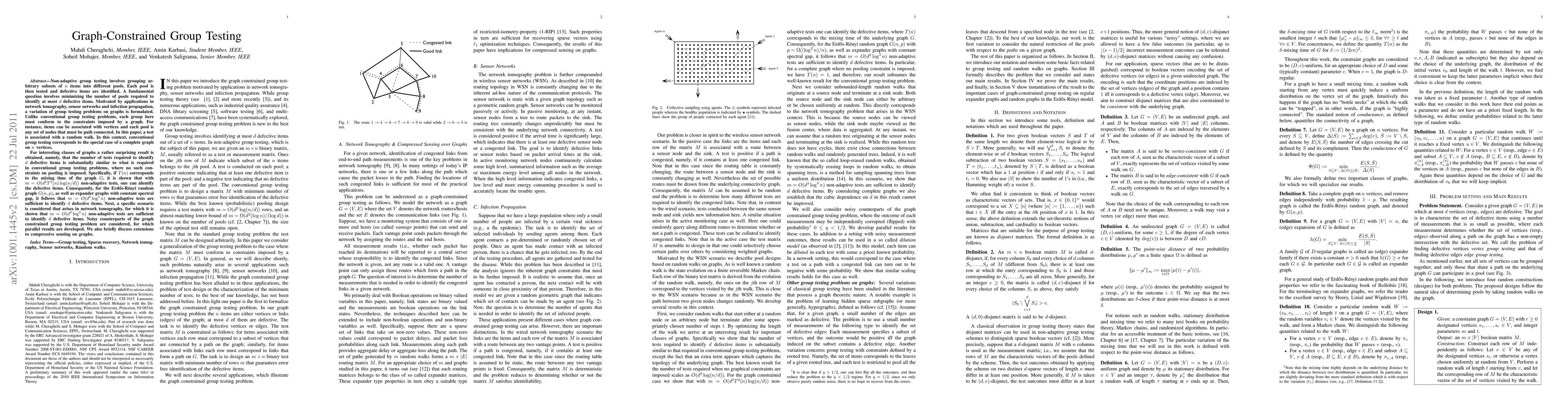 Non-adaptive group testing involves grouping arbitrary subsets of $n$ items into different pools. Each pool is then tested and defective items are identified. A fundamental question involves minimizing the number of pools required to identify at most $d$ defective items. Motivated by applications in network tomography, sensor networks and infection propagation, a variation of group testing problems on graphs is formulated. Unlike conventional group testing problems, each group here must conform to the constraints imposed by a graph. For instance, items can be associated with vertices and each pool is any set of nodes that must be path connected. In this paper, a test is associated with a random walk. In this context, conventional group testing corresponds to the special case of a complete graph on $n$ vertices. For interesting classes of graphs a rather surprising result is obtained, namely, that the number of tests required to identify $d$ defective items is substantially similar to what is required in conventional group testing problems, where no such constraints on pooling is imposed. Specifically, if T(n) corresponds to the mixing time of the graph $G$, it is shown that with $m=O(d^2T^2(n)\log(n/d))$ non-adaptive tests, one can identify the defective items. Consequently, for the Erdos-Renyi random graph $G(n,p)$, as well as expander graphs with constant spectral gap, it follows that $m=O(d^2\log^3n)$ non-adaptive tests are sufficient to identify $d$ defective items. Next, a specific scenario is considered that arises in network tomography, for which it is shown that $m=O(d^3\log^3n)$ non-adaptive tests are sufficient to identify $d$ defective items. Noisy counterparts of the graph constrained group testing problem are considered, for which parallel results are developed. We also briefly discuss extensions to compressive sensing on graphs.