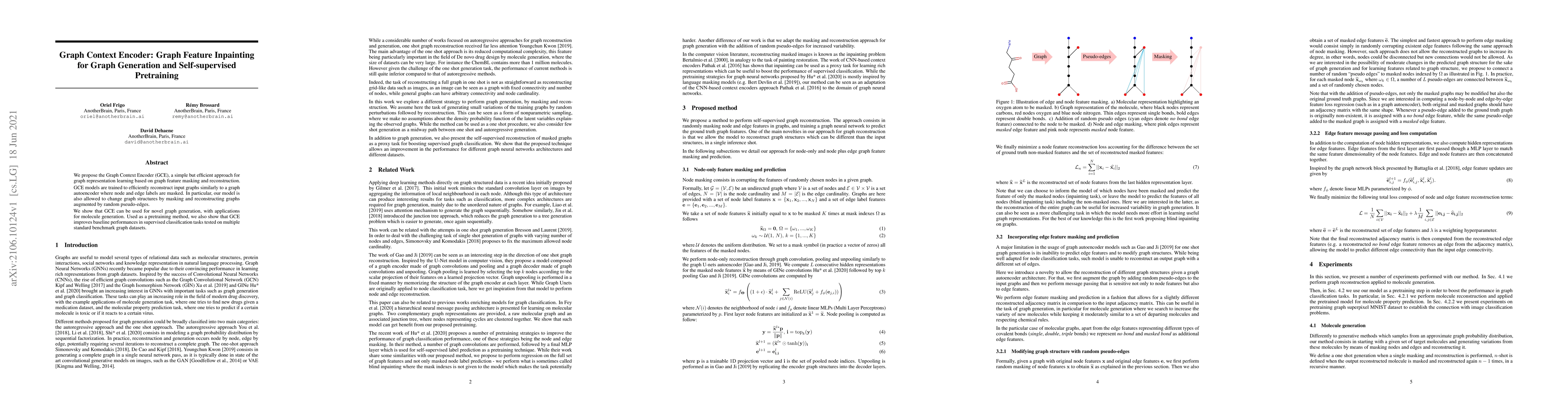 We propose the Graph Context Encoder (GCE), a simple but efficient approach for graph representation learning based on graph feature masking and reconstruction. GCE models are trained to efficiently reconstruct input graphs similarly to a graph autoencoder where node and edge labels are masked. In particular, our model is also allowed to change graph structures by masking and reconstructing graphs augmented by random pseudo-edges. We show that GCE can be used for novel graph generation, with applications for molecule generation. Used as a pretraining method, we also show that GCE improves baseline performances in supervised classification tasks tested on multiple standard benchmark graph datasets.