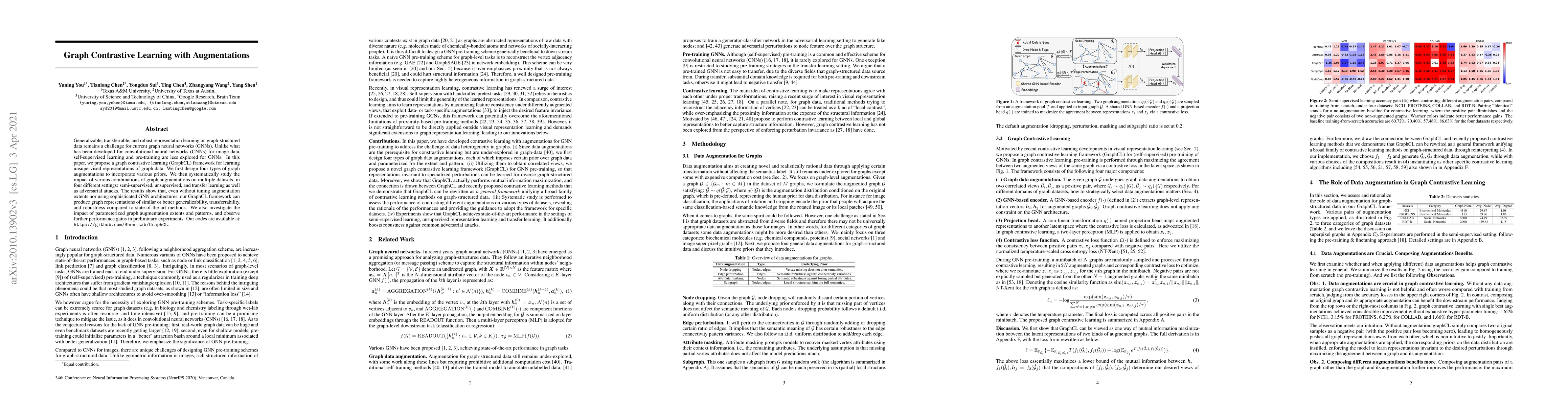 This paper proposes a graph contrastive learning framework called GraphCL to learn robust and generalizable representations for graph-structured data. The authors introduce four types of graph augmentations and demonstrate that the framework can achieve comparable or better performance than state-of-the-art methods across various learning settings, even without fine-tuning.