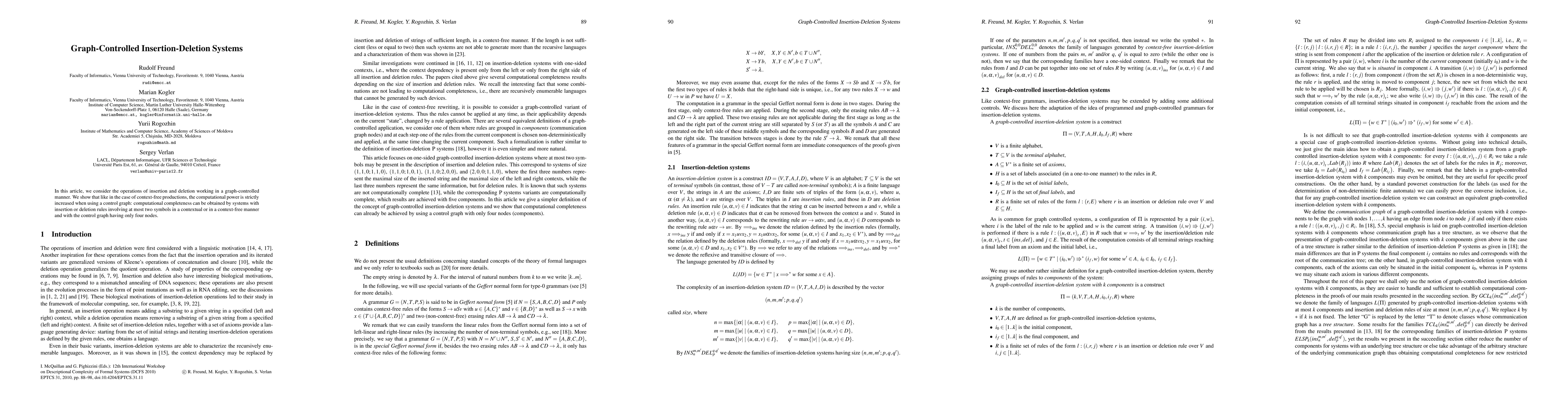 This paper explores graph-controlled insertion-deletion systems, demonstrating that computational power increases with a control graph, achieving completeness using systems with limited insertion or deletion rules and a four-node graph.