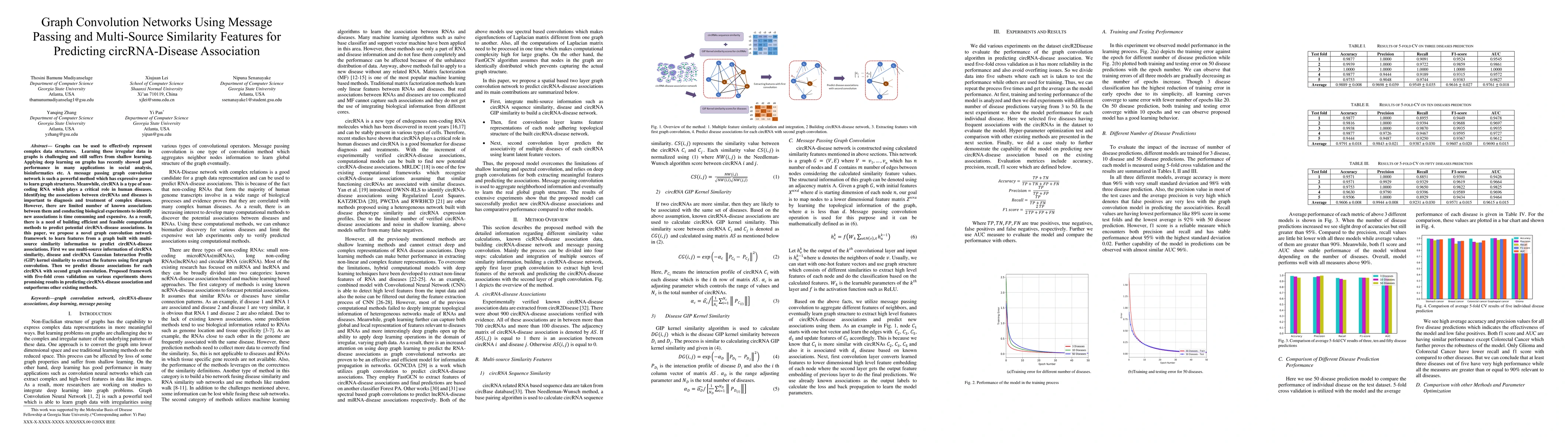 This paper introduces a graph convolution network framework that leverages multi-source similarity features to predict circRNA-disease associations. The method uses message passing to extract features from a graph constructed with circRNA similarity and disease interaction profiles, achieving superior performance over existing techniques in predicting potential associations.