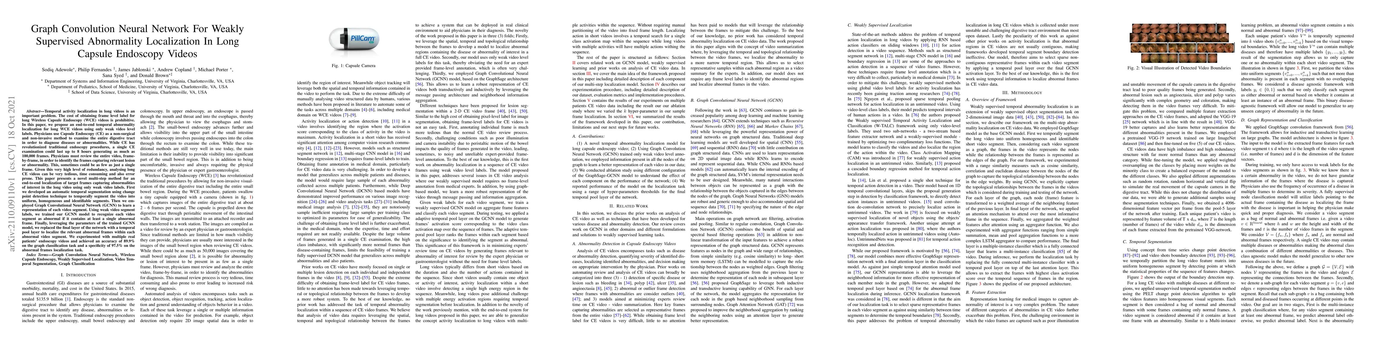 Temporal activity localization in long videos is an important problem. The cost of obtaining frame level label for long Wireless Capsule Endoscopy (WCE) videos is prohibitive. In this paper, we propose an end-to-end temporal abnormality localization for long WCE videos using only weak video level labels. Physicians use Capsule Endoscopy (CE) as a non-surgical and non-invasive method to examine the entire digestive tract in order to diagnose diseases or abnormalities. While CE has revolutionized traditional endoscopy procedures, a single CE examination could last up to 8 hours generating as much as 100,000 frames. Physicians must review the entire video, frame-by-frame, in order to identify the frames capturing relevant abnormality. This, sometimes could be as few as just a single frame. Given this very high level of redundancy, analyzing long CE videos can be very tedious, time consuming and also error prone. This paper presents a novel multi-step method for an end-to-end localization of target frames capturing abnormalities of interest in the long video using only weak video labels. First we developed an automatic temporal segmentation using change point detection technique to temporally segment the video into uniform, homogeneous and identifiable segments. Then we employed Graph Convolutional Neural Network (GCNN) to learn a representation of each video segment. Using weak video segment labels, we trained our GCNN model to recognize each video segment as abnormal if it contains at least a single abnormal frame. Finally, leveraging the parameters of the trained GCNN model, we replaced the final layer of the network with a temporal pool layer to localize the relevant abnormal frames within each abnormal video segment. Our method achieved an accuracy of 89.9\% on the graph classification task and a specificity of 97.5\% on the abnormal frames localization task.
