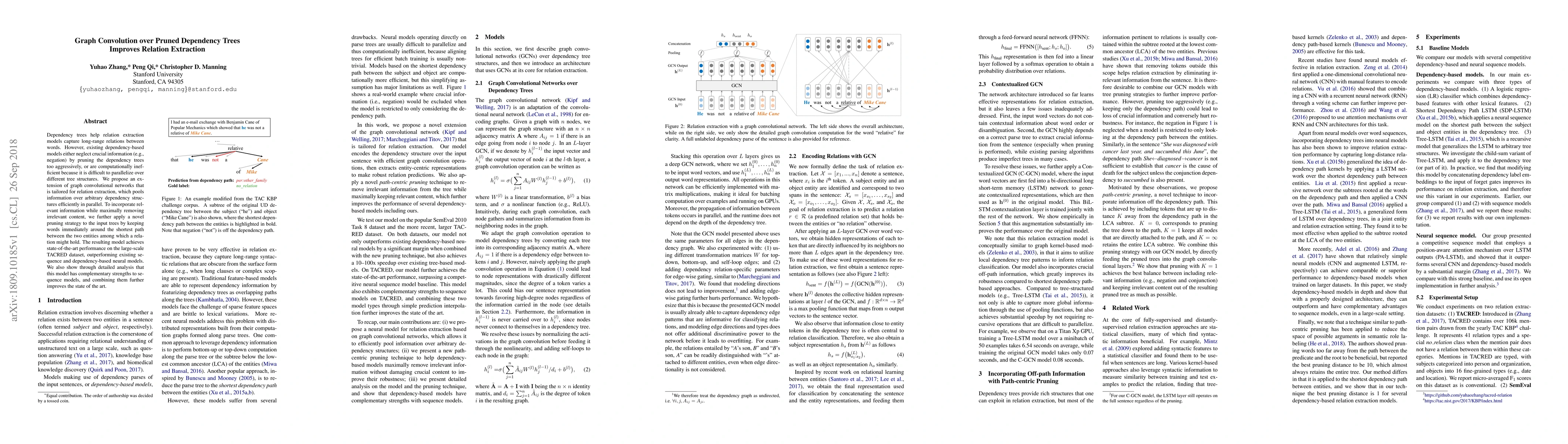 This paper proposes a graph convolutional network tailored for relation extraction that efficiently processes pruned dependency trees, balancing the retention of crucial information and computational efficiency. The model achieves top performance on the TACRED dataset and demonstrates complementary strengths when combined with sequence models.