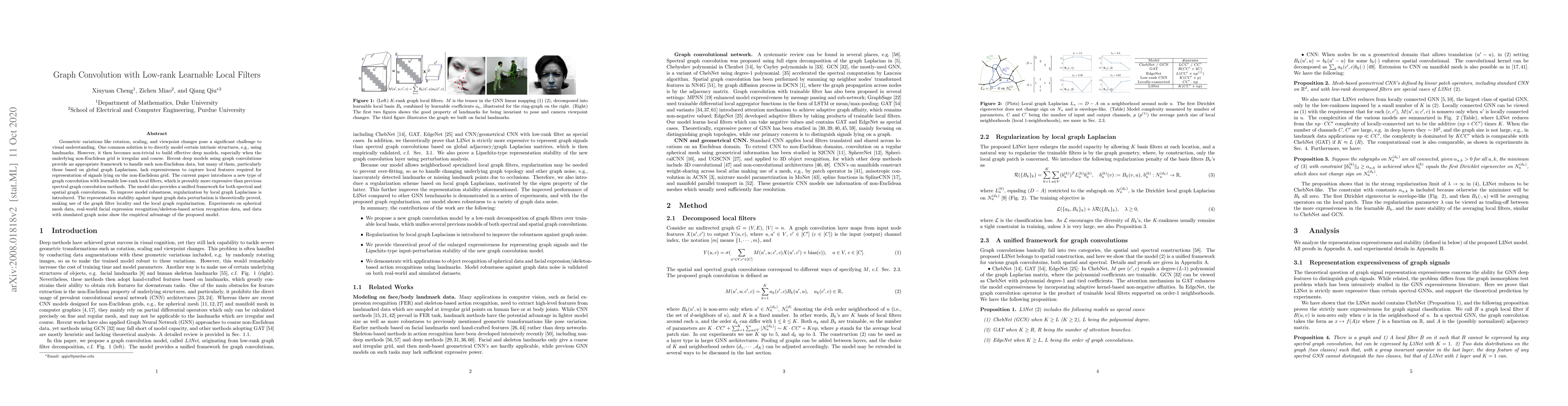 Geometric variations like rotation, scaling, and viewpoint changes pose a significant challenge to visual understanding. One common solution is to directly model certain intrinsic structures, e.g., using landmarks. However, it then becomes non-trivial to build effective deep models, especially when the underlying non-Euclidean grid is irregular and coarse. Recent deep models using graph convolutions provide an appropriate framework to handle such non-Euclidean data, but many of them, particularly those based on global graph Laplacians, lack expressiveness to capture local features required for representation of signals lying on the non-Euclidean grid. The current paper introduces a new type of graph convolution with learnable low-rank local filters, which is provably more expressive than previous spectral graph convolution methods. The model also provides a unified framework for both spectral and spatial graph convolutions. To improve model robustness, regularization by local graph Laplacians is introduced. The representation stability against input graph data perturbation is theoretically proved, making use of the graph filter locality and the local graph regularization. Experiments on spherical mesh data, real-world facial expression recognition/skeleton-based action recognition data, and data with simulated graph noise show the empirical advantage of the proposed model.