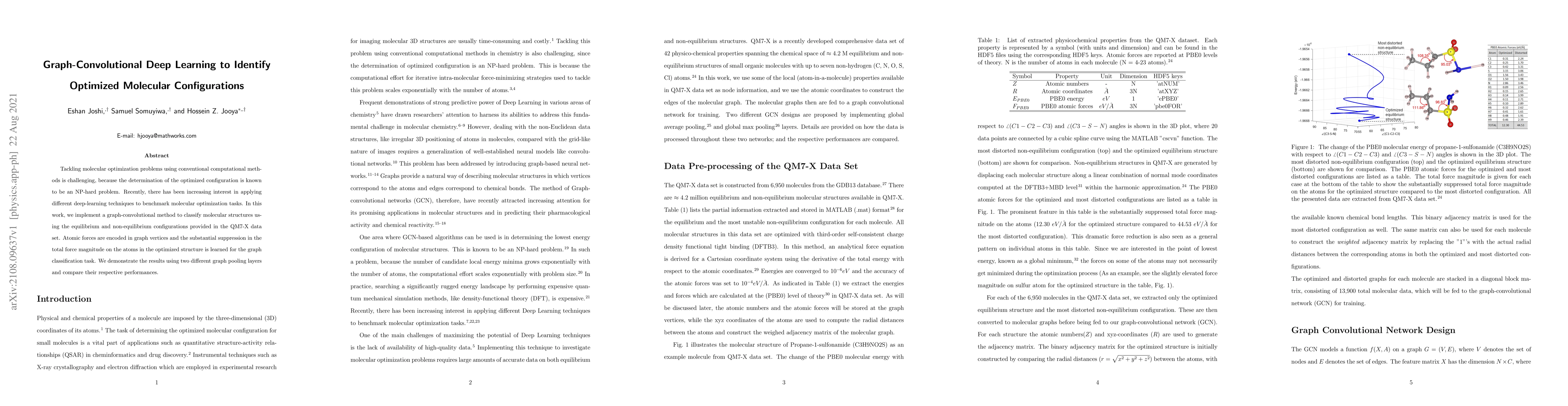 Tackling molecular optimization problems using conventional computational methods is challenging, because the determination of the optimized configuration is known to be an NP-hard problem. Recently, there has been increasing interest in applying different deep-learning techniques to benchmark molecular optimization tasks. In this work, we implement a graph-convolutional method to classify molecular structures using the equilibrium and non-equilibrium configurations provided in the QM7-X data set. Atomic forces are encoded in graph vertices and the substantial suppression in the total force magnitude on the atoms in the optimized structure is learned for the graph classification task. We demonstrate the results using two different graph pooling layers and compare their respective performances.
