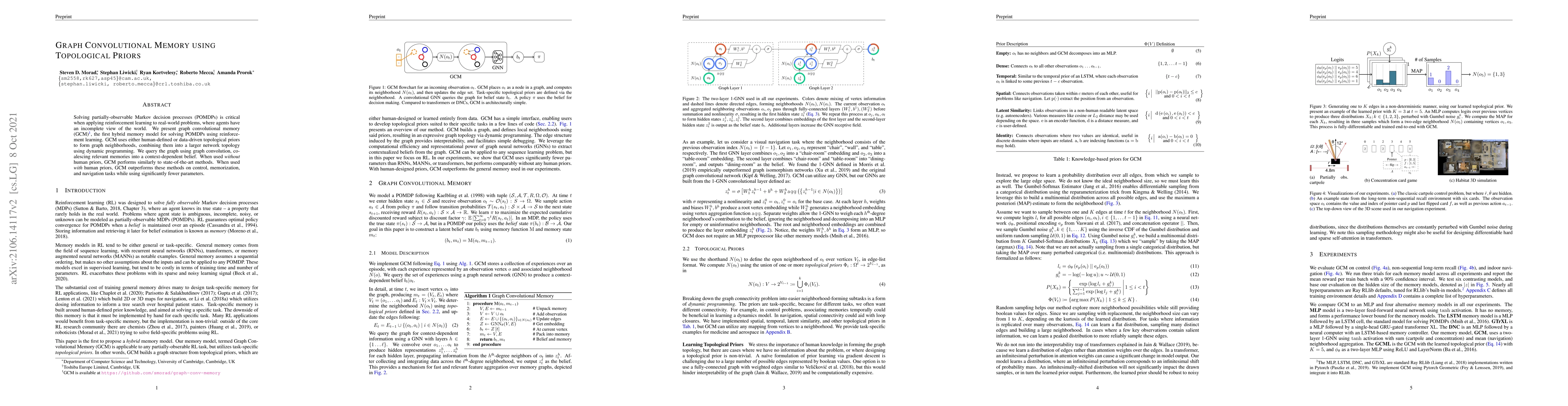 Solving partially-observable Markov decision processes (POMDPs) is critical when applying reinforcement learning to real-world problems, where agents have an incomplete view of the world. We present graph convolutional memory (GCM), the first hybrid memory model for solving POMDPs using reinforcement learning. GCM uses either human-defined or data-driven topological priors to form graph neighborhoods, combining them into a larger network topology using dynamic programming. We query the graph using graph convolution, coalescing relevant memories into a context-dependent belief. When used without human priors, GCM performs similarly to state-of-the-art methods. When used with human priors, GCM outperforms these methods on control, memorization, and navigation tasks while using significantly fewer parameters.