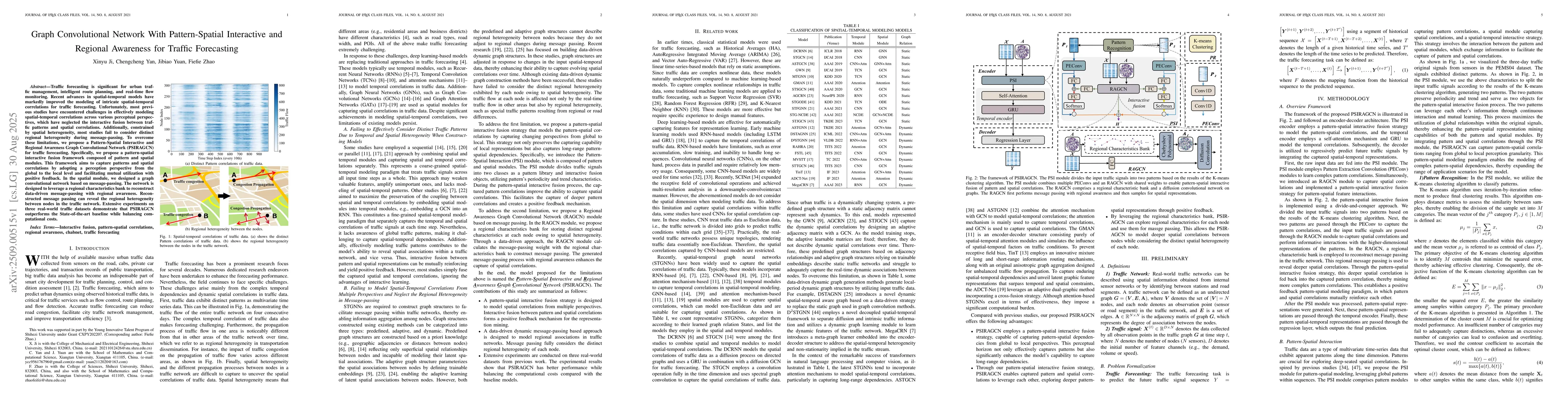 Traffic forecasting is significant for urban traffic management, intelligent route planning, and real-time flow monitoring. Recent advances in spatial-temporal models have markedly improved the modeling of intricate spatial-temporal correlations for traffic forecasting. Unfortunately, most previous studies have encountered challenges in effectively modeling spatial-temporal correlations across various perceptual perspectives, which have neglected the interactive fusion between traffic patterns and spatial correlations. Additionally, constrained by spatial heterogeneity, most studies fail to consider distinct regional heterogeneity during message-passing. To overcome these limitations, we propose a Pattern-Spatial Interactive and Regional Awareness Graph Convolutional Network (PSIRAGCN) for traffic forecasting. Specifically, we propose a pattern-spatial interactive fusion framework composed of pattern and spatial modules. This framework aims to capture patterns and spatial correlations by adopting a perception perspective from the global to the local level and facilitating mutual utilization with positive feedback. In the spatial module, we designed a graph convolutional network based on message-passing. The network is designed to leverage a regional characteristics bank to reconstruct data-driven message-passing with regional awareness. Reconstructed message passing can reveal the regional heterogeneity between nodes in the traffic network. Extensive experiments on three real-world traffic datasets demonstrate that PSIRAGCN outperforms the State-of-the-art baseline while balancing computational costs.
