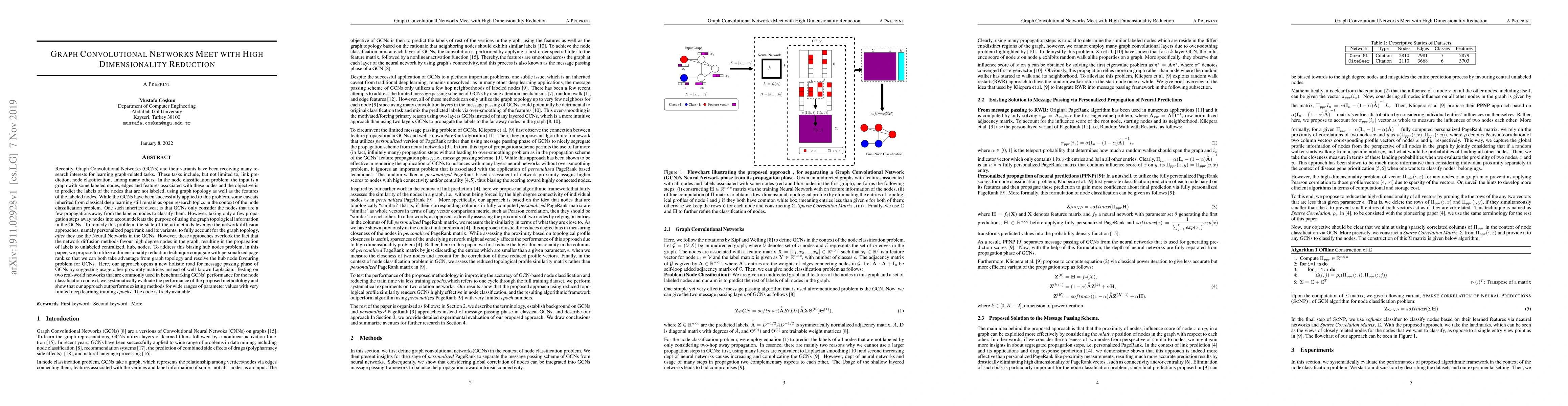 Recently, Graph Convolutional Networks (GCNs) and their variants have been receiving many research interests for learning graph-related tasks. While the GCNs have been successfully applied to this problem, some caveats inherited from classical deep learning still remain as open research topics in the context of the node classification problem. One such inherited caveat is that GCNs only consider the nodes that are a few propagations away from the labeled nodes to classify them. However, taking only a few propagation steps away nodes into account defeats the purpose of using the graph topological information in the GCNs. To remedy this problem, the-state-of-the-art methods leverage the network diffusion approaches, namely personalized page rank and its variants, to fully account for the graph topology, {\em after} they use the Neural Networks in the GCNs. However, these approaches overlook the fact that the network diffusion methods favour high degree nodes in the graph, resulting in the propagation of labels to unlabeled centralized, hub, nodes. To address this biasing hub nodes problem, in this paper, we propose to utilize a dimensionality reduction technique conjugate with personalized page rank so that we can both take advantage from graph topology and resolve the hub node favouring problem for GCNs. Here, our approach opens a new holistic road for message passing phase of GCNs by suggesting the usage of other proximity matrices instead of well-known Laplacian. Testing on two real-world networks that are commonly used in benchmarking GCNs' performance for the node classification context, we systematically evaluate the performance of the proposed methodology and show that our approach outperforms existing methods for wide ranges of parameter values with very limited deep learning training {\em epochs}.