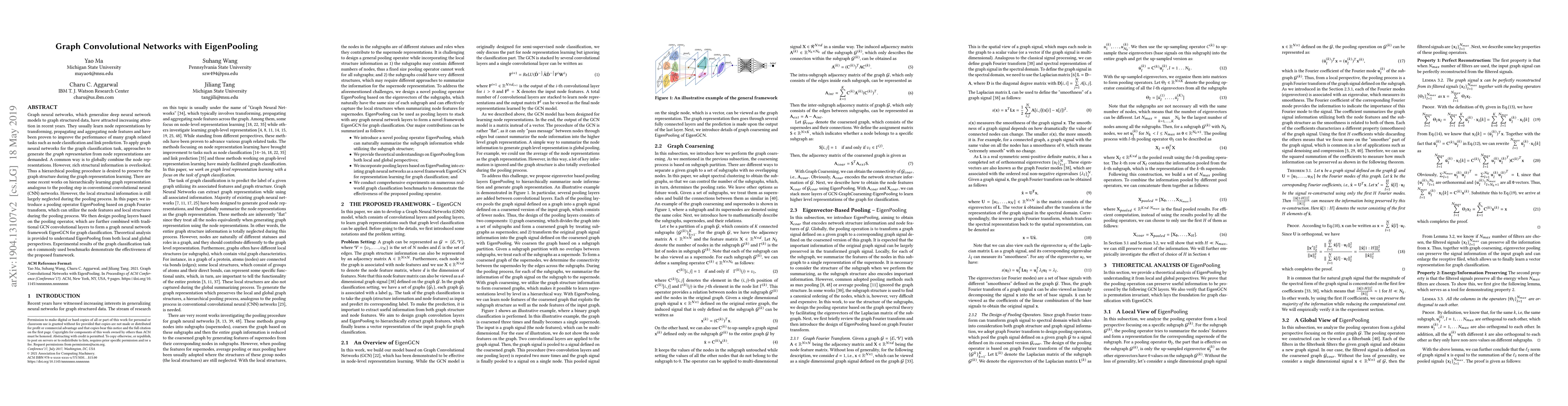 This paper proposes a novel pooling operator, EigenPooling, based on graph Fourier transform to enhance graph convolutional networks (GCNs) by preserving local structural information during graph representation learning. The framework combining EigenPooling with GCN layers shows improved performance in graph classification tasks on multiple benchmarks.