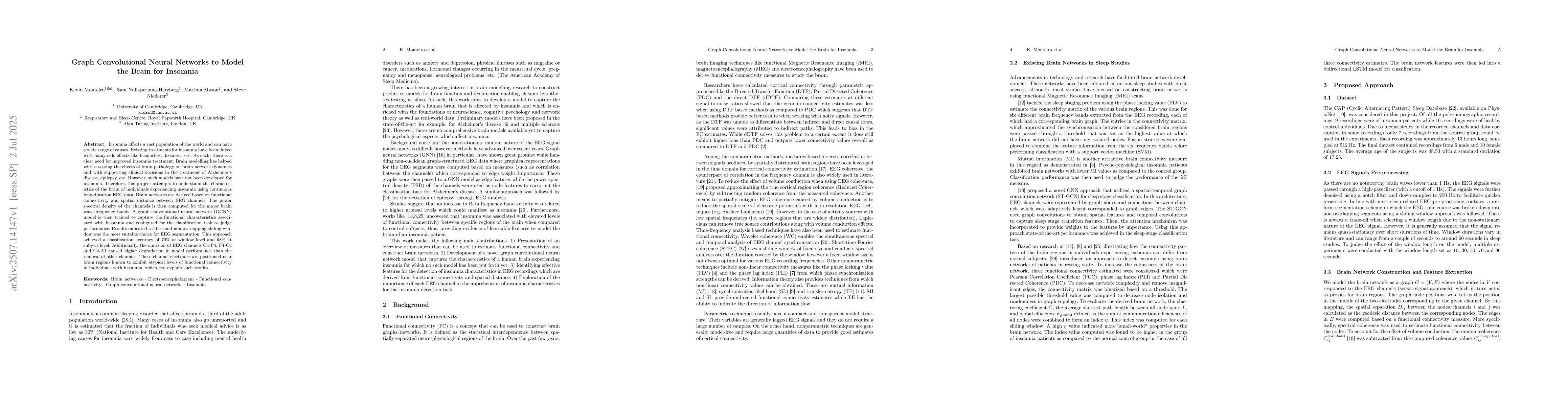 Insomnia affects a vast population of the world and can have a wide range of causes. Existing treatments for insomnia have been linked with many side effects like headaches, dizziness, etc. As such, there is a clear need for improved insomnia treatment. Brain modelling has helped with assessing the effects of brain pathology on brain network dynamics and with supporting clinical decisions in the treatment of Alzheimer's disease, epilepsy, etc. However, such models have not been developed for insomnia. Therefore, this project attempts to understand the characteristics of the brain of individuals experiencing insomnia using continuous long-duration EEG data. Brain networks are derived based on functional connectivity and spatial distance between EEG channels. The power spectral density of the channels is then computed for the major brain wave frequency bands. A graph convolutional neural network (GCNN) model is then trained to capture the functional characteristics associated with insomnia and configured for the classification task to judge performance. Results indicated a 50-second non-overlapping sliding window was the most suitable choice for EEG segmentation. This approach achieved a classification accuracy of 70% at window level and 68% at subject level. Additionally, the omission of EEG channels C4-P4, F4-C4 and C4-A1 caused higher degradation in model performance than the removal of other channels. These channel electrodes are positioned near brain regions known to exhibit atypical levels of functional connectivity in individuals with insomnia, which can explain such results.