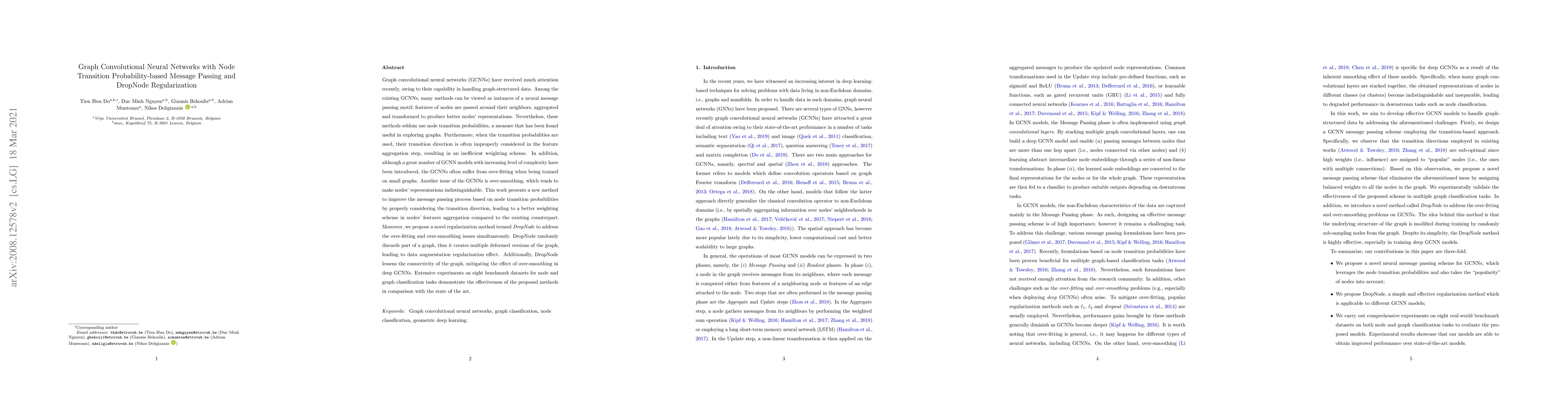This research paper proposes a new method for Graph Convolutional Neural Networks (GCNNs) that incorporates node transition probabilities and DropNode regularization to improve message passing and reduce overfitting and over-smoothing.