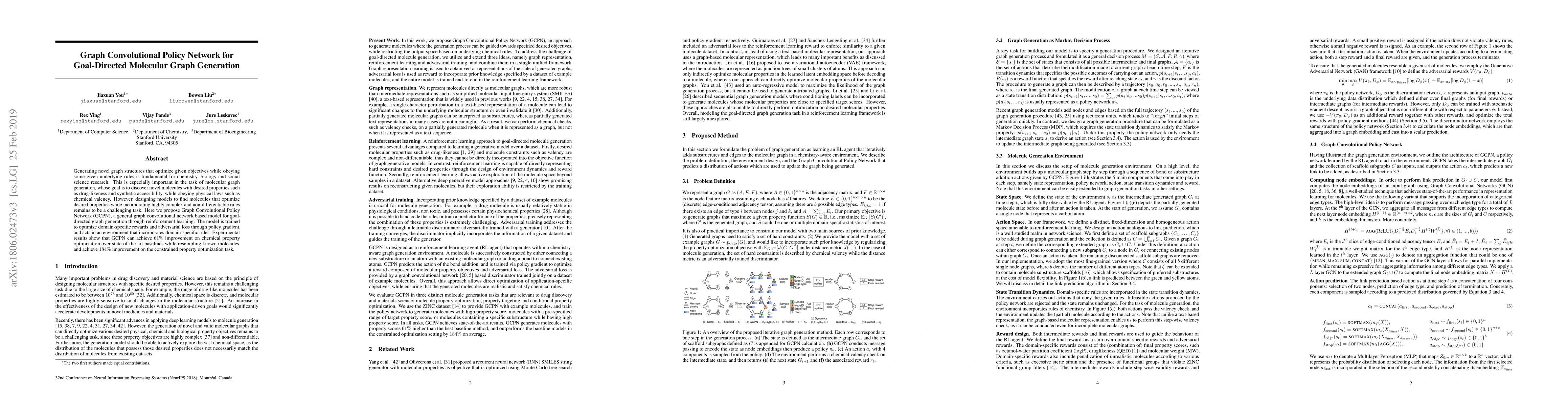 This paper proposes a Graph Convolutional Policy Network (GCPN) for generating novel molecular graphs that optimize desired properties while adhering to chemical rules. GCPN leverages reinforcement learning to achieve significant improvements in chemical property optimization and constrained property optimization tasks compared to state-of-the-art baselines.