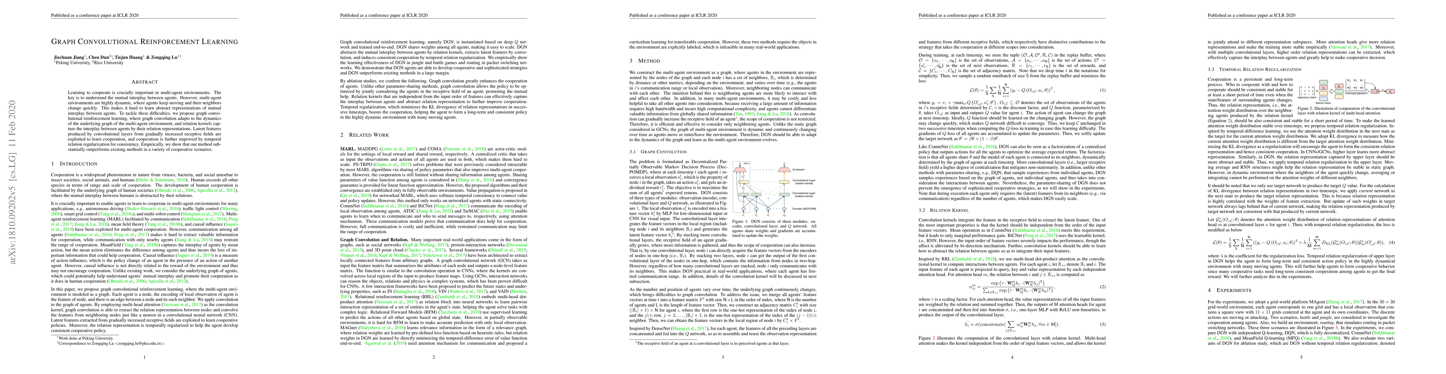 This paper proposes graph convolutional reinforcement learning to tackle the challenges of cooperation in dynamic multi-agent environments. The method leverages graph convolutions to adapt to the changing graph structure and relation kernels to capture agent interactions, achieving superior performance over existing methods in cooperative tasks.