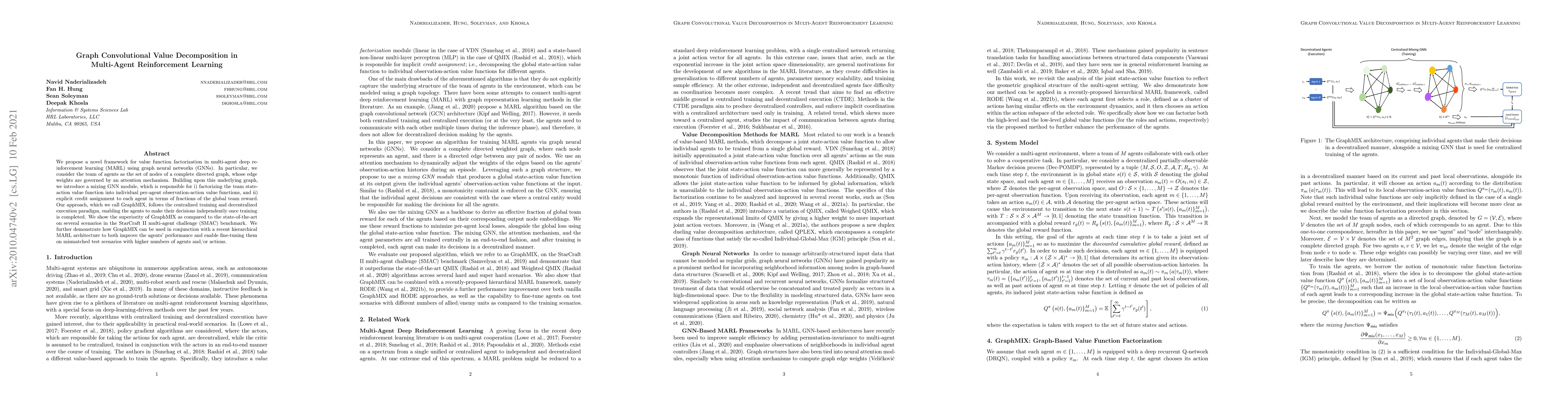This paper introduces GraphMIX, a novel framework using graph convolutional networks for value function factorization in multi-agent reinforcement learning. It decomposes team state-action value functions into individual agent value functions, enabling effective credit assignment and improved performance over state-of-the-art methods in the StarCraft II multi-agent challenge.
