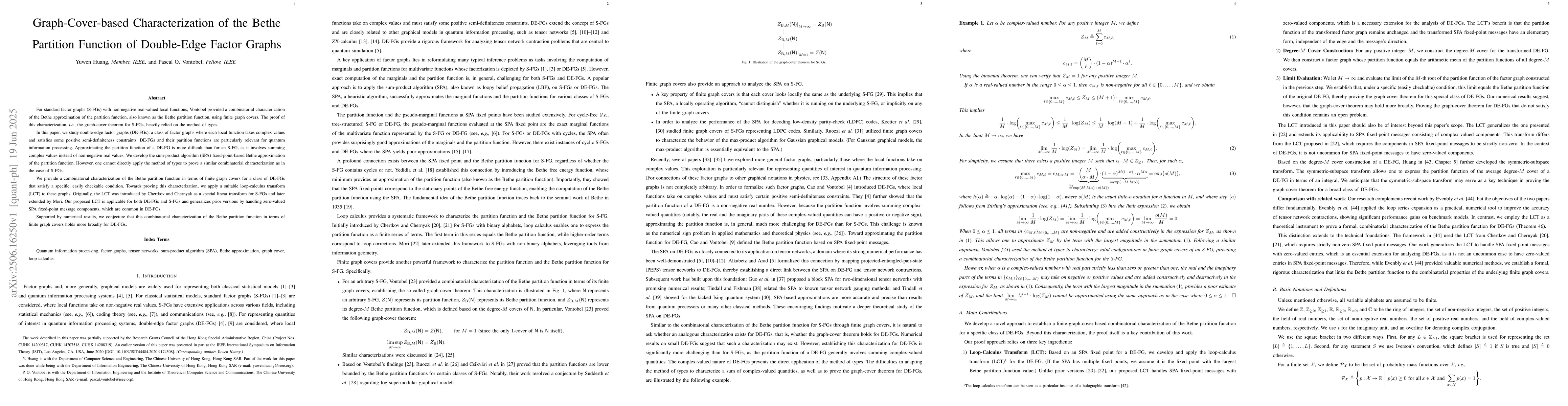 For standard factor graphs (S-FGs) with non-negative real-valued local functions, Vontobel provided a combinatorial characterization of the Bethe approximation of the partition function, also known as the Bethe partition function, using finite graph covers. The proof of this characterization, i.e., the graph-cover theorem for S-FGs, heavily relied on the method of types. In this paper, we study double-edge factor graphs (DE-FGs), a class of factor graphs where each local function takes complex values and satisfies some positive semi-definiteness constraints. DE-FGs and their partition functions are particularly relevant for quantum information processing. Approximating the partition function of a DE-FG is more difficult than for an S-FG, as it involves summing complex values instead of non-negative real values. We develop the sum-product algorithm (SPA) fixed-point-based Bethe approximation of the partition function. However, one cannot directly apply the method of types to prove a similar combinatorial characterization as in the case of S-FGs. We provide a combinatorial characterization of the Bethe partition function in terms of finite graph covers for a class of DE-FGs that satisfy a specific, easily checkable condition. Towards proving this characterization, we apply a suitable loop-calculus transform (LCT) to these graphs. Originally, the LCT was introduced by Chertkov and Chernyak as a special linear transform for S-FGs and later extended by Mori. Our proposed LCT is applicable for both DE-FGs and S-FGs and generalizes prior versions by handling zero-valued SPA fixed-point message components, which are common in DE-FGs. Supported by numerical results, we conjecture that this combinatorial characterization of the Bethe partition function in terms of finite graph covers holds more broadly for DE-FGs.