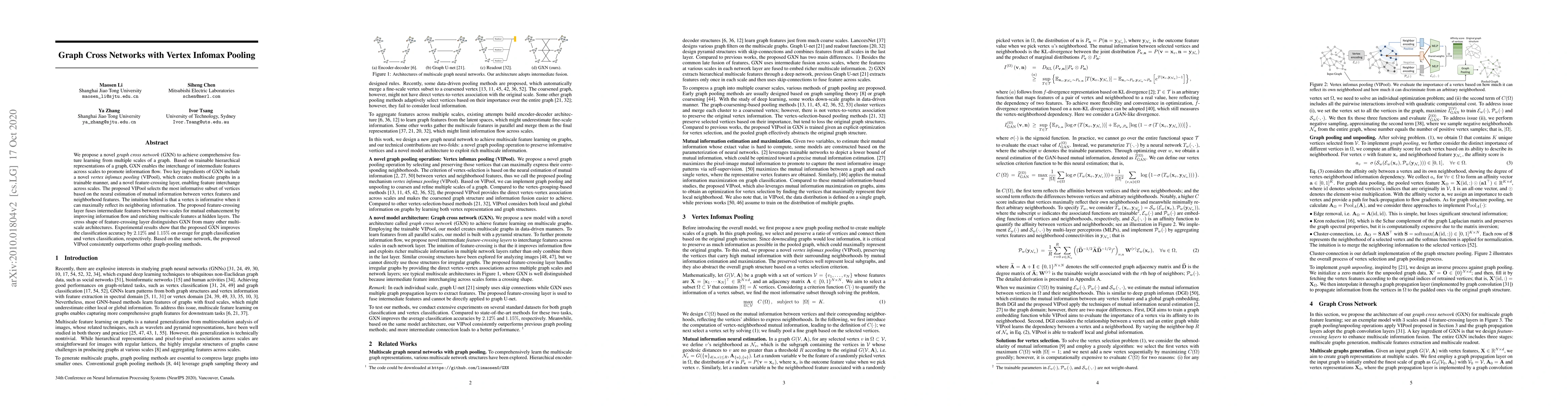 We propose a novel graph cross network (GXN) to achieve comprehensive feature learning from multiple scales of a graph. Based on trainable hierarchical representations of a graph, GXN enables the interchange of intermediate features across scales to promote information flow. Two key ingredients of GXN include a novel vertex infomax pooling (VIPool), which creates multiscale graphs in a trainable manner, and a novel feature-crossing layer, enabling feature interchange across scales. The proposed VIPool selects the most informative subset of vertices based on the neural estimation of mutual information between vertex features and neighborhood features. The intuition behind is that a vertex is informative when it can maximally reflect its neighboring information. The proposed feature-crossing layer fuses intermediate features between two scales for mutual enhancement by improving information flow and enriching multiscale features at hidden layers. The cross shape of the feature-crossing layer distinguishes GXN from many other multiscale architectures. Experimental results show that the proposed GXN improves the classification accuracy by 2.12% and 1.15% on average for graph classification and vertex classification, respectively. Based on the same network, the proposed VIPool consistently outperforms other graph-pooling methods.