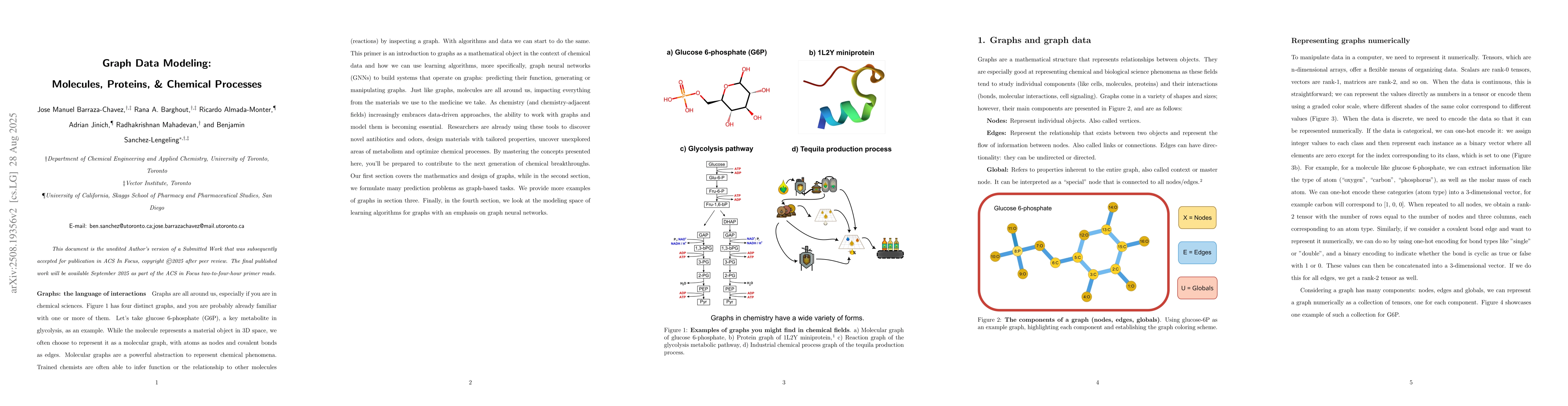 Graphs are central to the chemical sciences, providing a natural language to describe molecules, proteins, reactions, and industrial processes. They capture interactions and structures that underpin materials, biology, and medicine. This primer, Graph Data Modeling: Molecules, Proteins, & Chemical Processes, introduces graphs as mathematical objects in chemistry and shows how learning algorithms (particularly graph neural networks) can operate on them. We outline the foundations of graph design, key prediction tasks, representative examples across chemical sciences, and the role of machine learning in graph-based modeling. Together, these concepts prepare readers to apply graph methods to the next generation of chemical discovery.