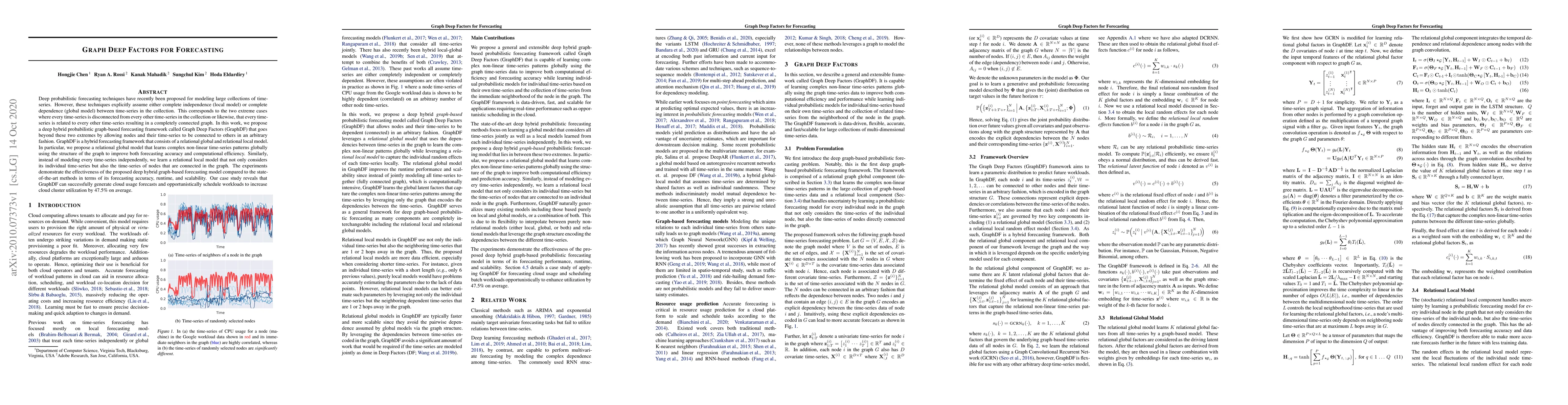Deep probabilistic forecasting techniques have recently been proposed for modeling large collections of time-series. However, these techniques explicitly assume either complete independence (local model) or complete dependence (global model) between time-series in the collection. This corresponds to the two extreme cases where every time-series is disconnected from every other time-series in the collection or likewise, that every time-series is related to every other time-series resulting in a completely connected graph. In this work, we propose a deep hybrid probabilistic graph-based forecasting framework called Graph Deep Factors (GraphDF) that goes beyond these two extremes by allowing nodes and their time-series to be connected to others in an arbitrary fashion. GraphDF is a hybrid forecasting framework that consists of a relational global and relational local model. In particular, we propose a relational global model that learns complex non-linear time-series patterns globally using the structure of the graph to improve both forecasting accuracy and computational efficiency. Similarly, instead of modeling every time-series independently, we learn a relational local model that not only considers its individual time-series but also the time-series of nodes that are connected in the graph. The experiments demonstrate the effectiveness of the proposed deep hybrid graph-based forecasting model compared to the state-of-the-art methods in terms of its forecasting accuracy, runtime, and scalability. Our case study reveals that GraphDF can successfully generate cloud usage forecasts and opportunistically schedule workloads to increase cloud cluster utilization by 47.5% on average.