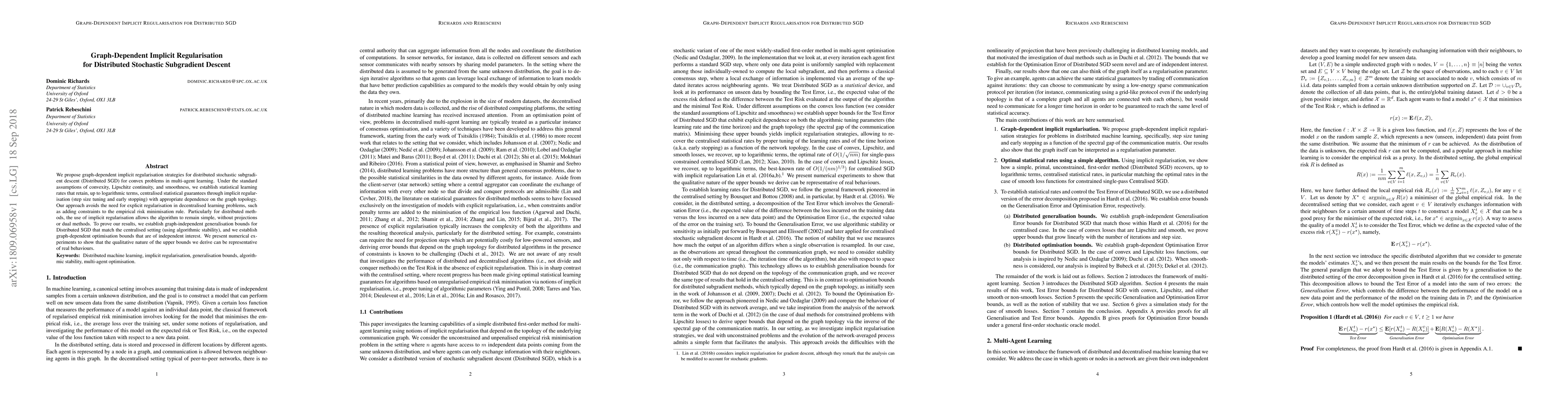 We propose graph-dependent implicit regularisation strategies for distributed stochastic subgradient descent (Distributed SGD) for convex problems in multi-agent learning. Under the standard assumptions of convexity, Lipschitz continuity, and smoothness, we establish statistical learning rates that retain, up to logarithmic terms, centralised statistical guarantees through implicit regularisation (step size tuning and early stopping) with appropriate dependence on the graph topology. Our approach avoids the need for explicit regularisation in decentralised learning problems, such as adding constraints to the empirical risk minimisation rule. Particularly for distributed methods, the use of implicit regularisation allows the algorithm to remain simple, without projections or dual methods. To prove our results, we establish graph-independent generalisation bounds for Distributed SGD that match the centralised setting (using algorithmic stability), and we establish graph-dependent optimisation bounds that are of independent interest. We present numerical experiments to show that the qualitative nature of the upper bounds we derive can be representative of real behaviours.