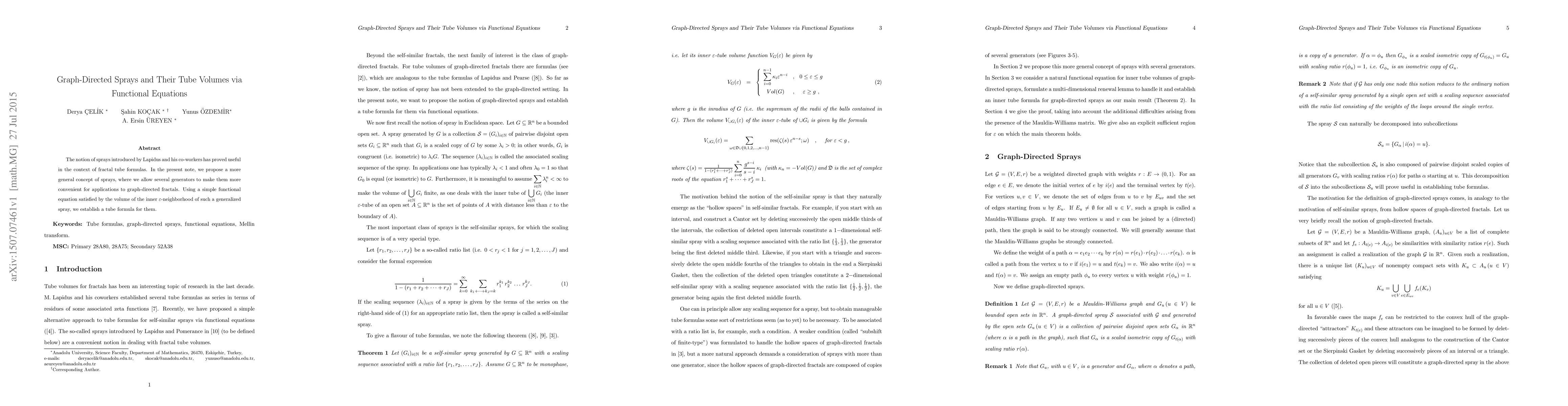 The notion of sprays introduced by Lapidus and his co-workers has proved useful in the context of fractal tube formulas. In the present note, we propose a more general concept of sprays, where we allow several generators to make them more convenient for applications to graph-directed fractals. Using a simple functional equation satisfied by the volume of the inner $\varepsilon$-neighborhood of such a generalized spray, we establish a tube formula for them.