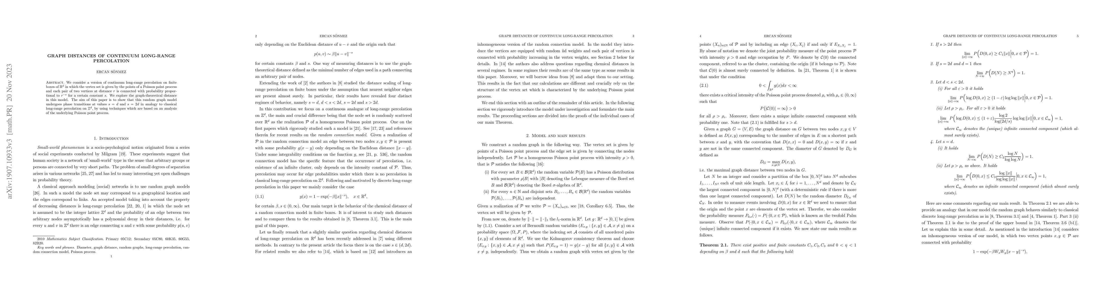 This paper explores a continuum long-range percolation model on $\mathbb{R}^d$ where edges form between vertices based on distance-dependent probabilities. It demonstrates phase transitions at $s=d$ and $s=2d$ analogous to classical percolation, using techniques rooted in Poisson point process analysis.