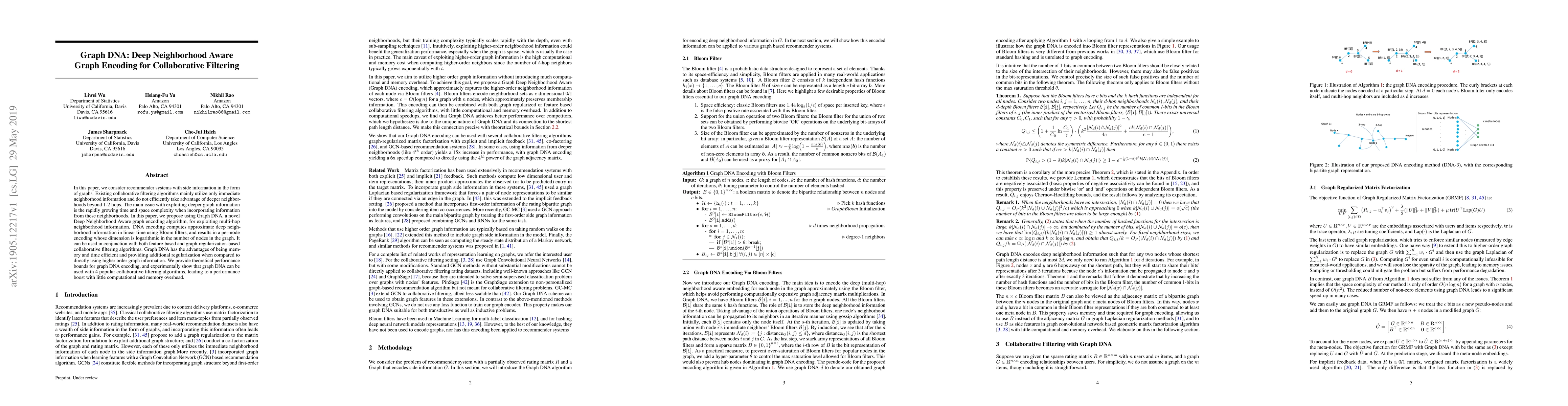 In this paper, we consider recommender systems with side information in the form of graphs. Existing collaborative filtering algorithms mainly utilize only immediate neighborhood information and have a hard time taking advantage of deeper neighborhoods beyond 1-2 hops. The main caveat of exploiting deeper graph information is the rapidly growing time and space complexity when incorporating information from these neighborhoods. In this paper, we propose using Graph DNA, a novel Deep Neighborhood Aware graph encoding algorithm, for exploiting deeper neighborhood information. DNA encoding computes approximate deep neighborhood information in linear time using Bloom filters, a space-efficient probabilistic data structure and results in a per-node encoding that is logarithmic in the number of nodes in the graph. It can be used in conjunction with both feature-based and graph-regularization-based collaborative filtering algorithms. Graph DNA has the advantages of being memory and time efficient and providing additional regularization when compared to directly using higher order graph information. We conduct experiments on real-world datasets, showing graph DNA can be easily used with 4 popular collaborative filtering algorithms and consistently leads to a performance boost with little computational and memory overhead.