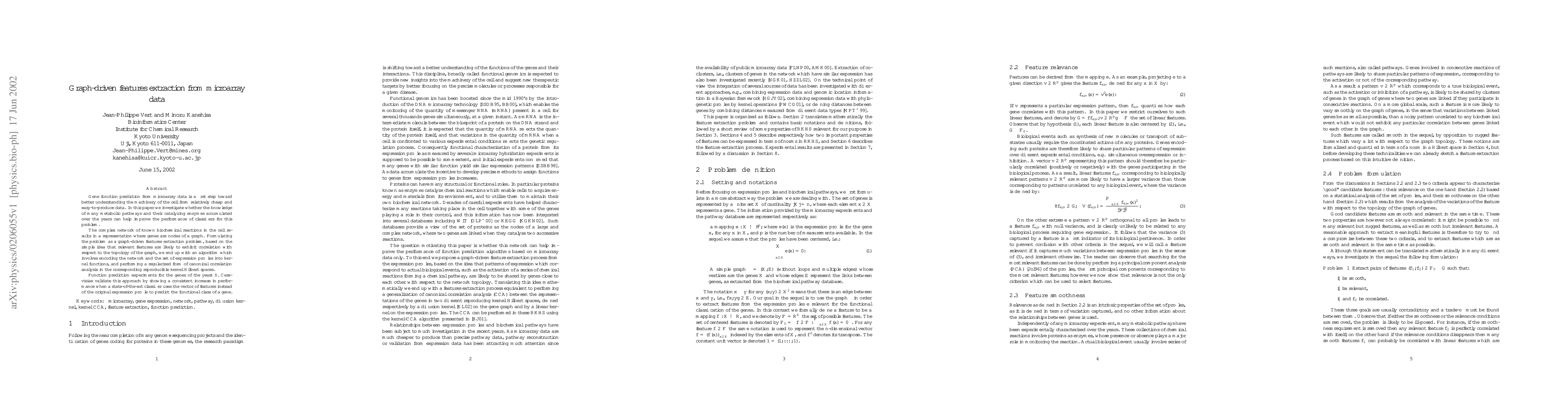 The research formulates gene function prediction from microarray data as a graph-driven features extraction problem. It encodes the network of biochemical reactions and expression profiles into kernel functions, followed by performing a regularized canonical correlation analysis in reproducible kernel Hilbert spaces.