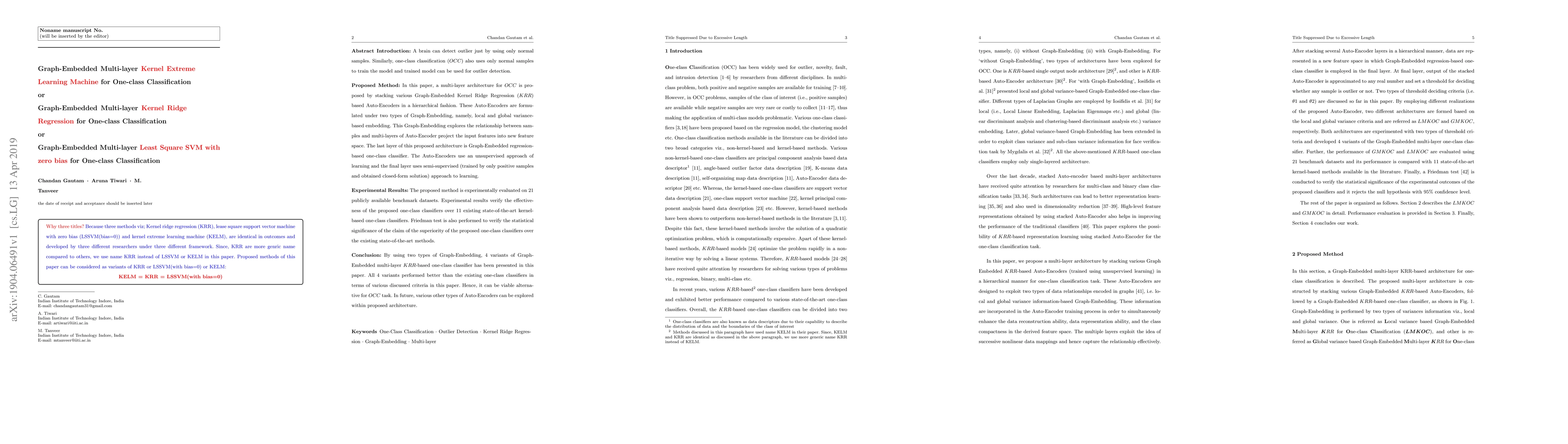 This paper proposes a multi-layer Graph-Embedded Kernel Ridge Regression-based Auto-Encoder architecture for one-class classification, utilizing local and global variance-based Graph-Embeddings. Experimental results show superior performance over 11 state-of-the-art methods, validated by Friedman test, indicating the effectiveness of the proposed method for outlier detection.
