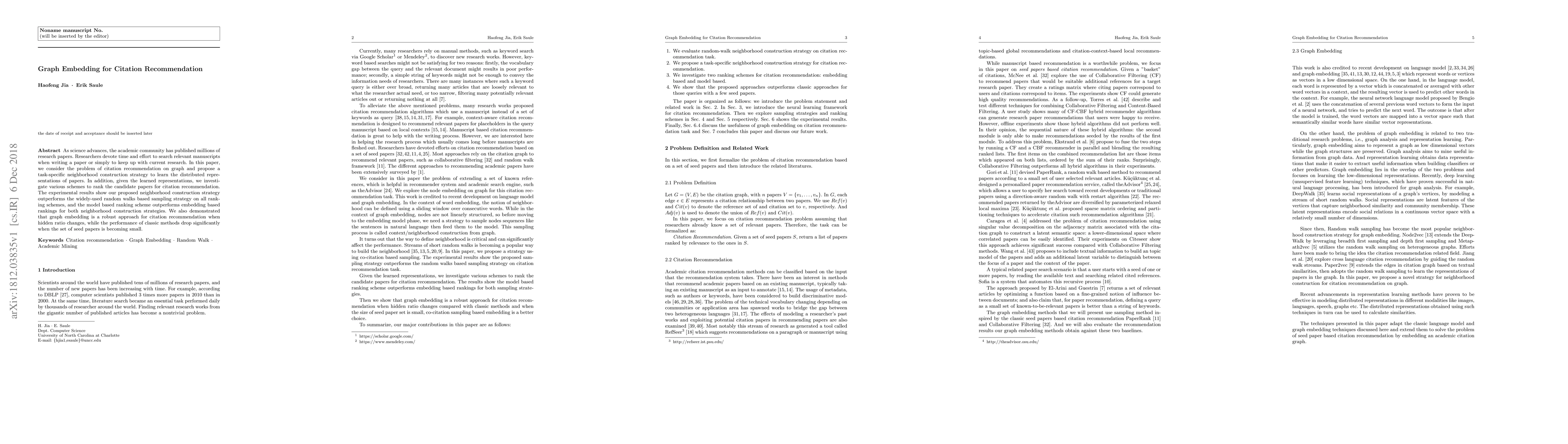 This paper proposes a novel graph embedding method for citation recommendation, utilizing a task-specific neighborhood construction strategy to learn paper representations. Experimental results show superior performance over random walks and traditional methods, especially when the seed paper set is small.