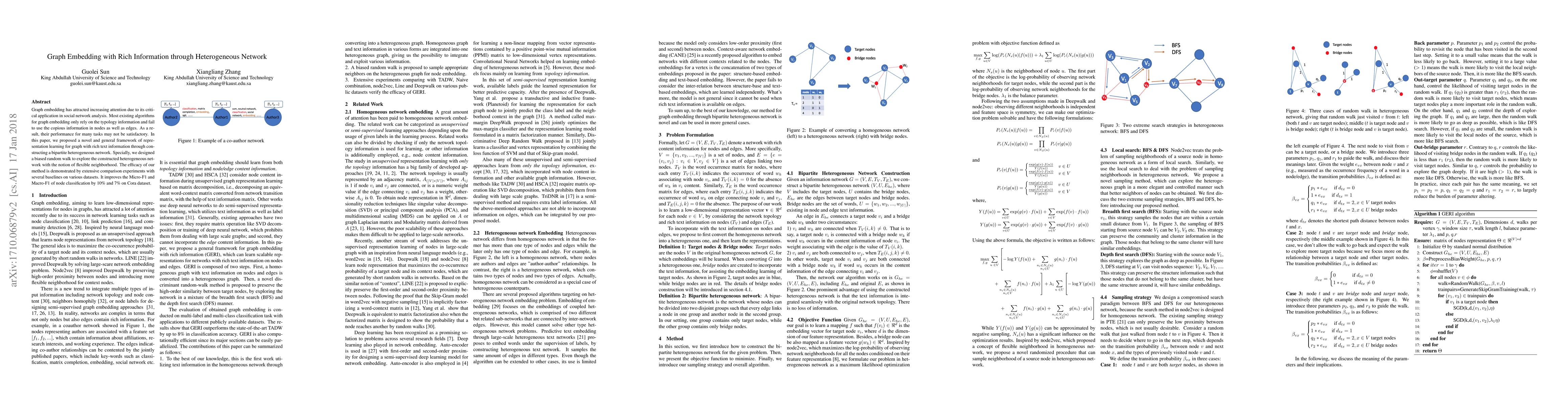 This paper proposes a novel framework for graph embedding that leverages rich text information by constructing a bipartite heterogeneous network. The method uses a biased random walk to explore the network, achieving a 10% and 7% improvement in Micro-F1 and Macro-F1 for node classification on the Cora dataset compared to baselines.