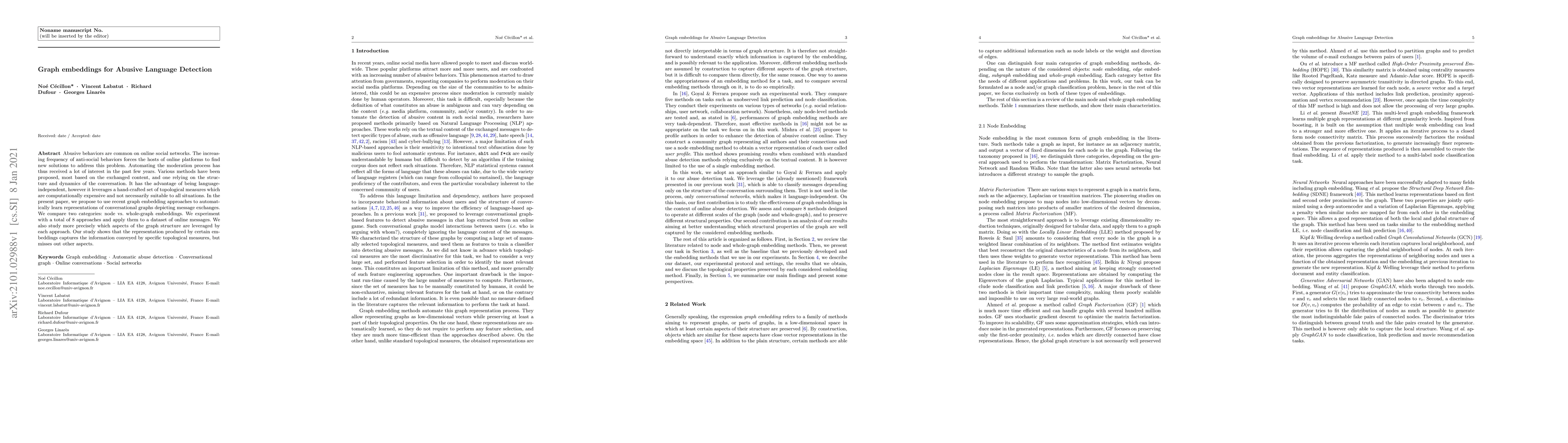 This paper proposes using graph embedding techniques to automatically learn representations of conversational graphs for abusive language detection. It compares node and whole-graph embeddings, experimenting with eight methods and analyzing which aspects of the graph structure each approach leverages. The study finds that certain embeddings capture specific topological information but miss others.